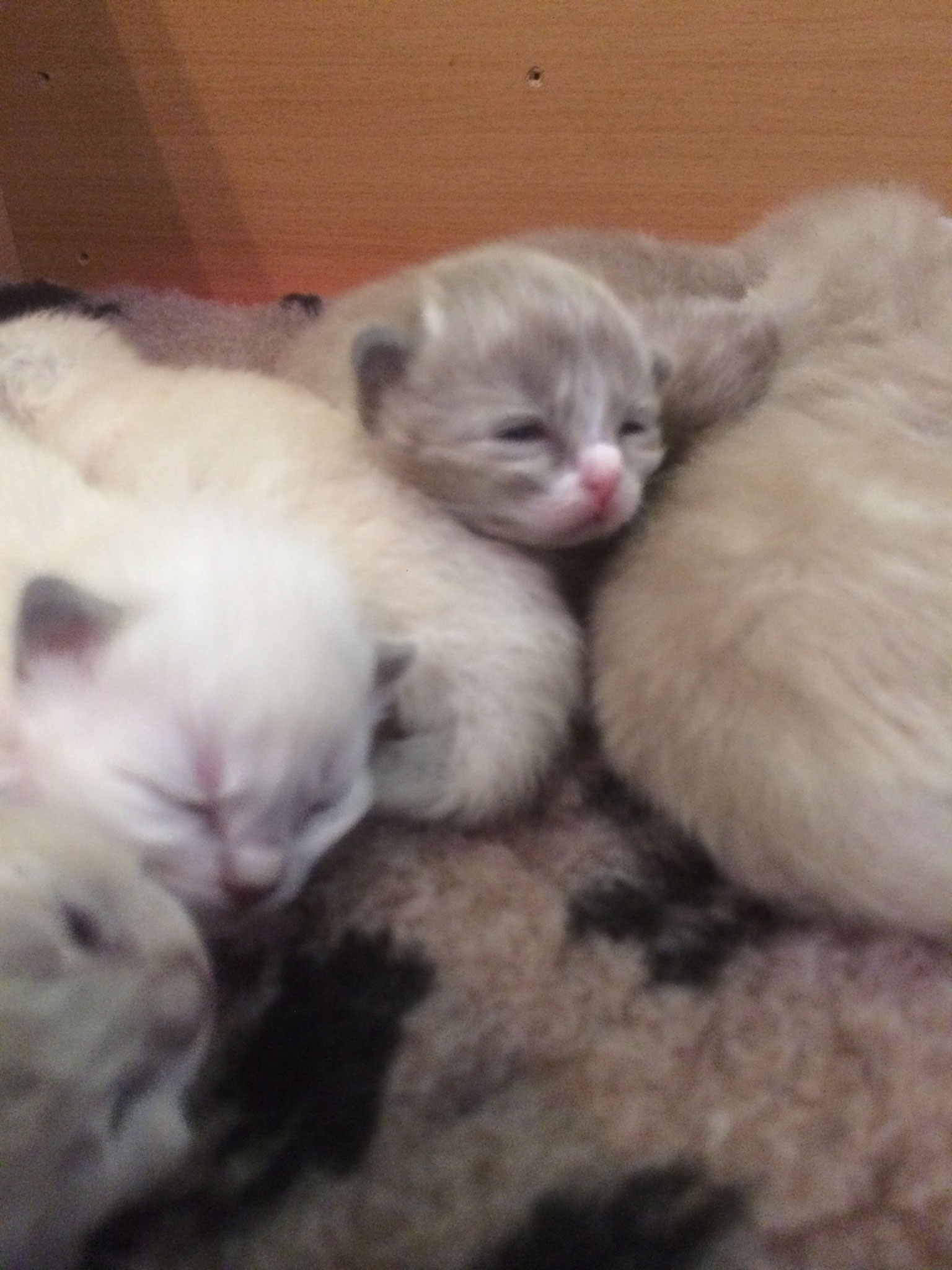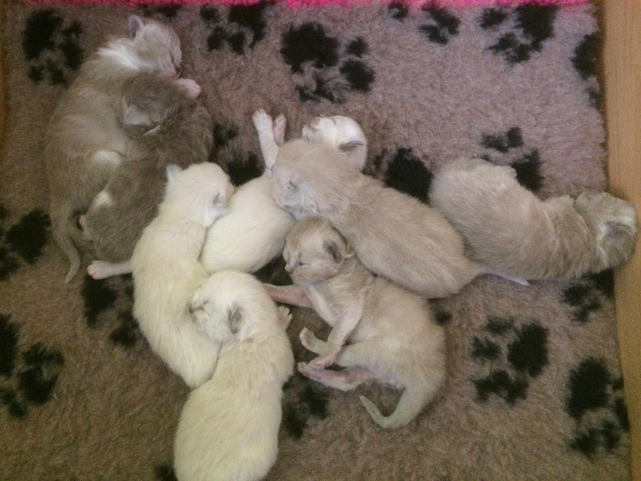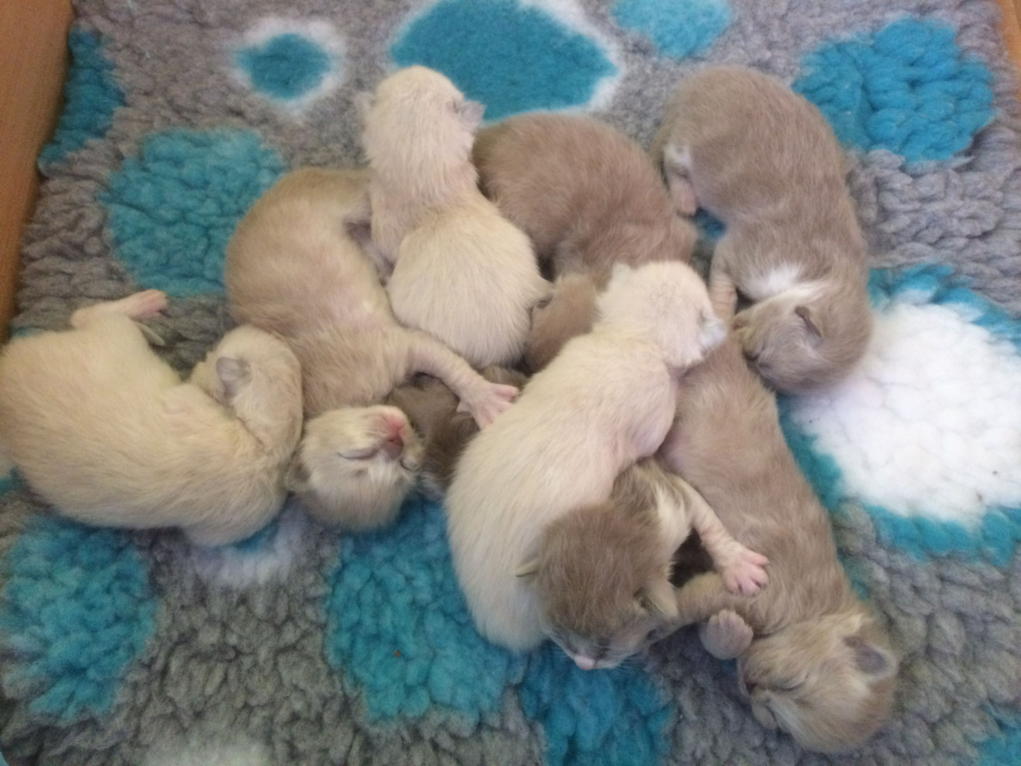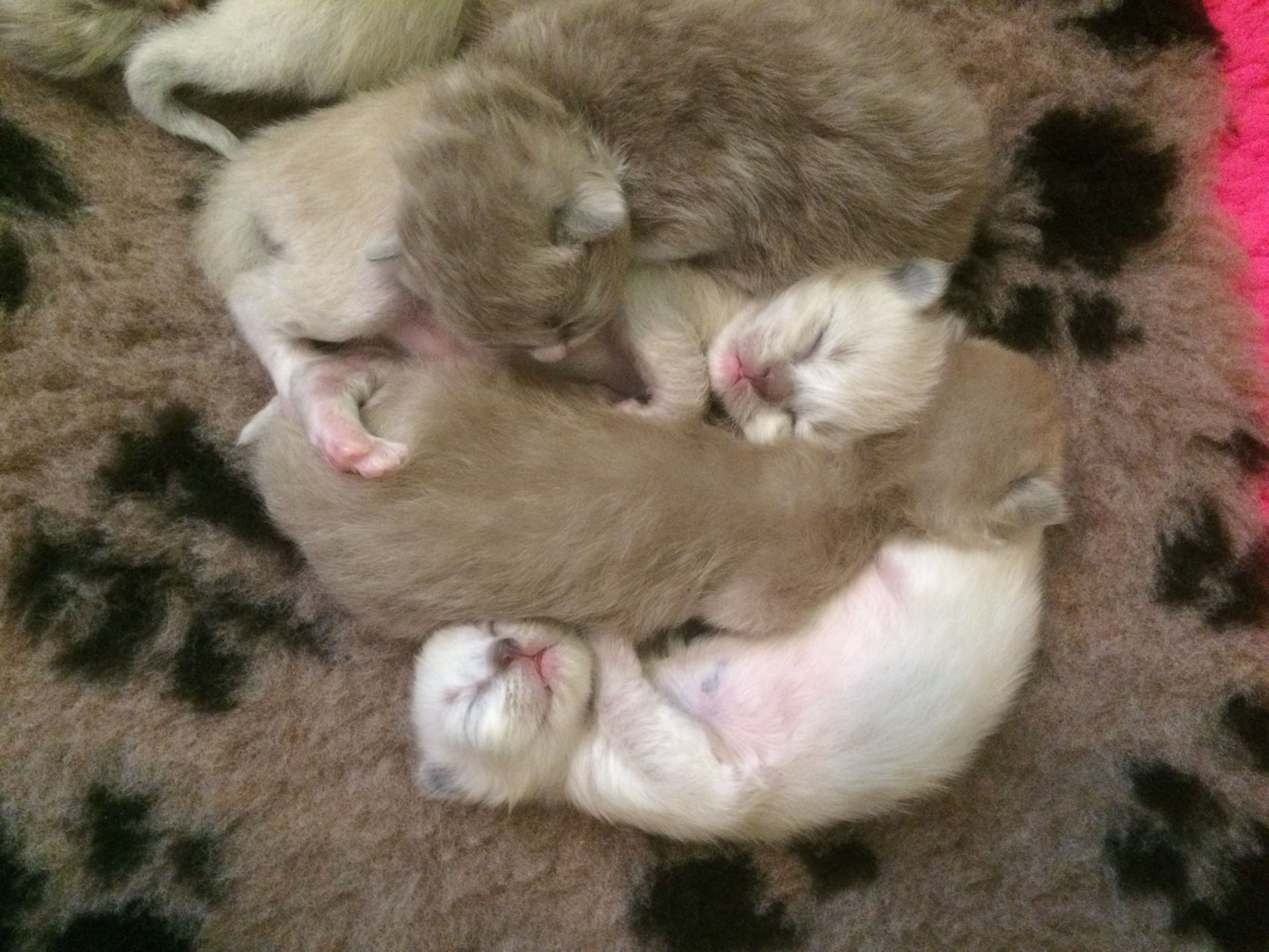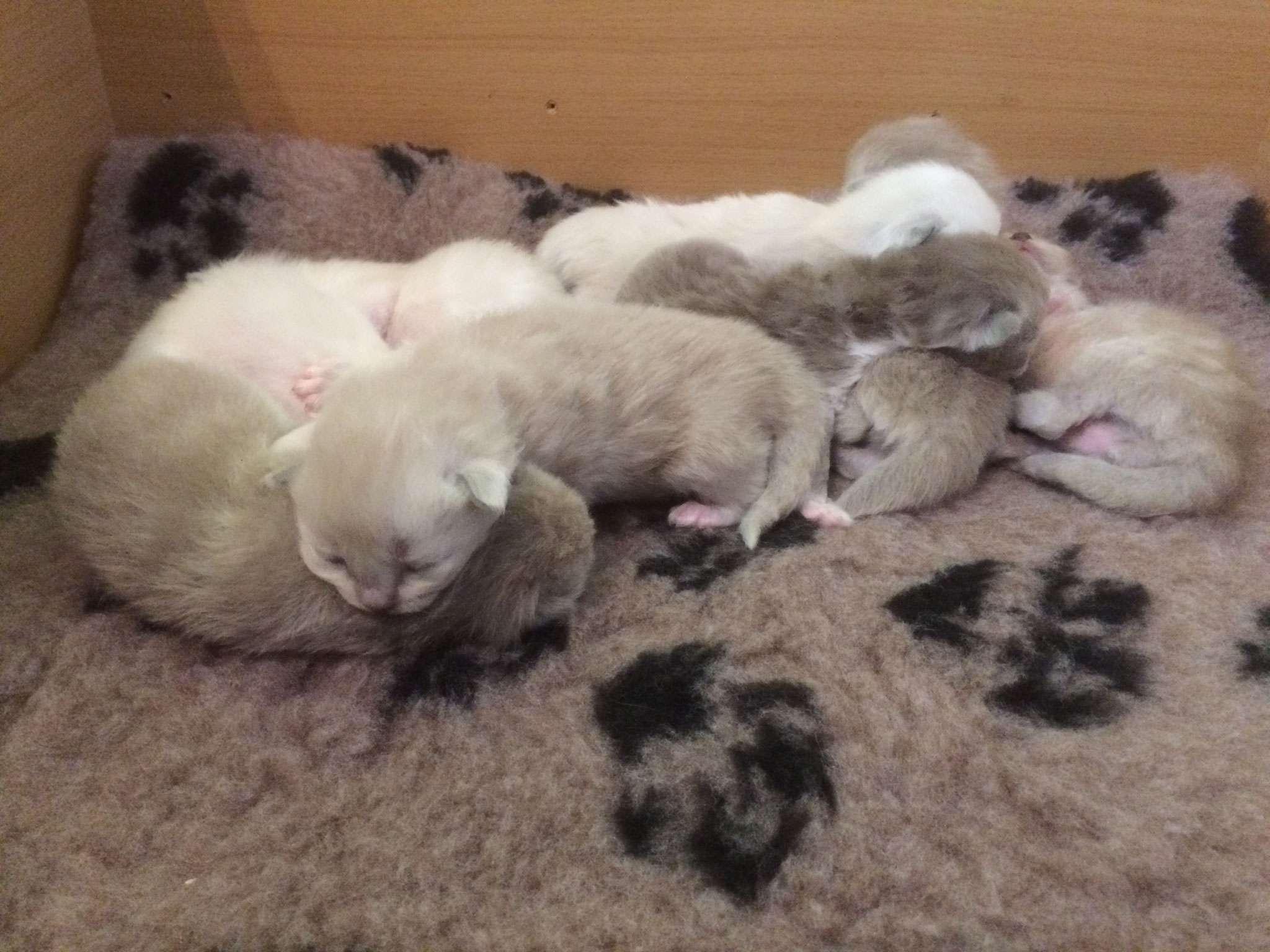 De kittens zijn vandaag 2 weken oud. Ik twijfel nog steeds over de kleur. Er zijn drie lichte kittens bij, maar die waren wel gekleurd bij de geboorte, dus ik weet niet goed wat ik ervan moet denken. Ofwel zijn ze lilac mink ofwel toch blue point. De anderen zijn blue mink denk ik en er zit één donkere bij dus dat zal een blue sepia zijn.