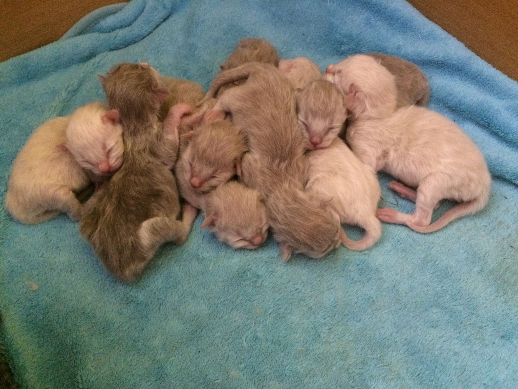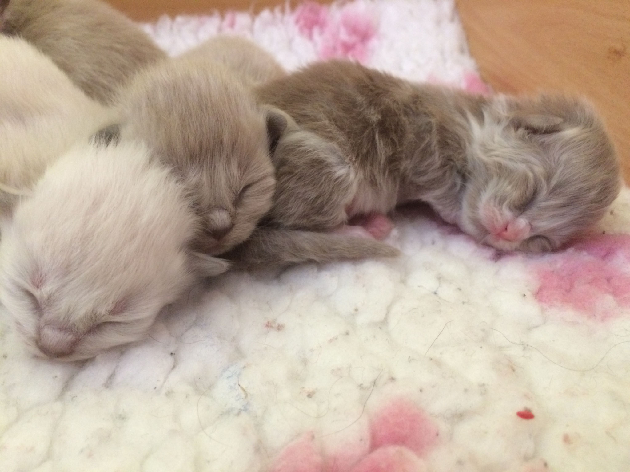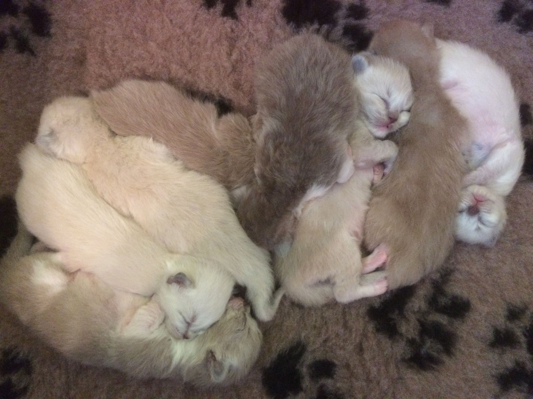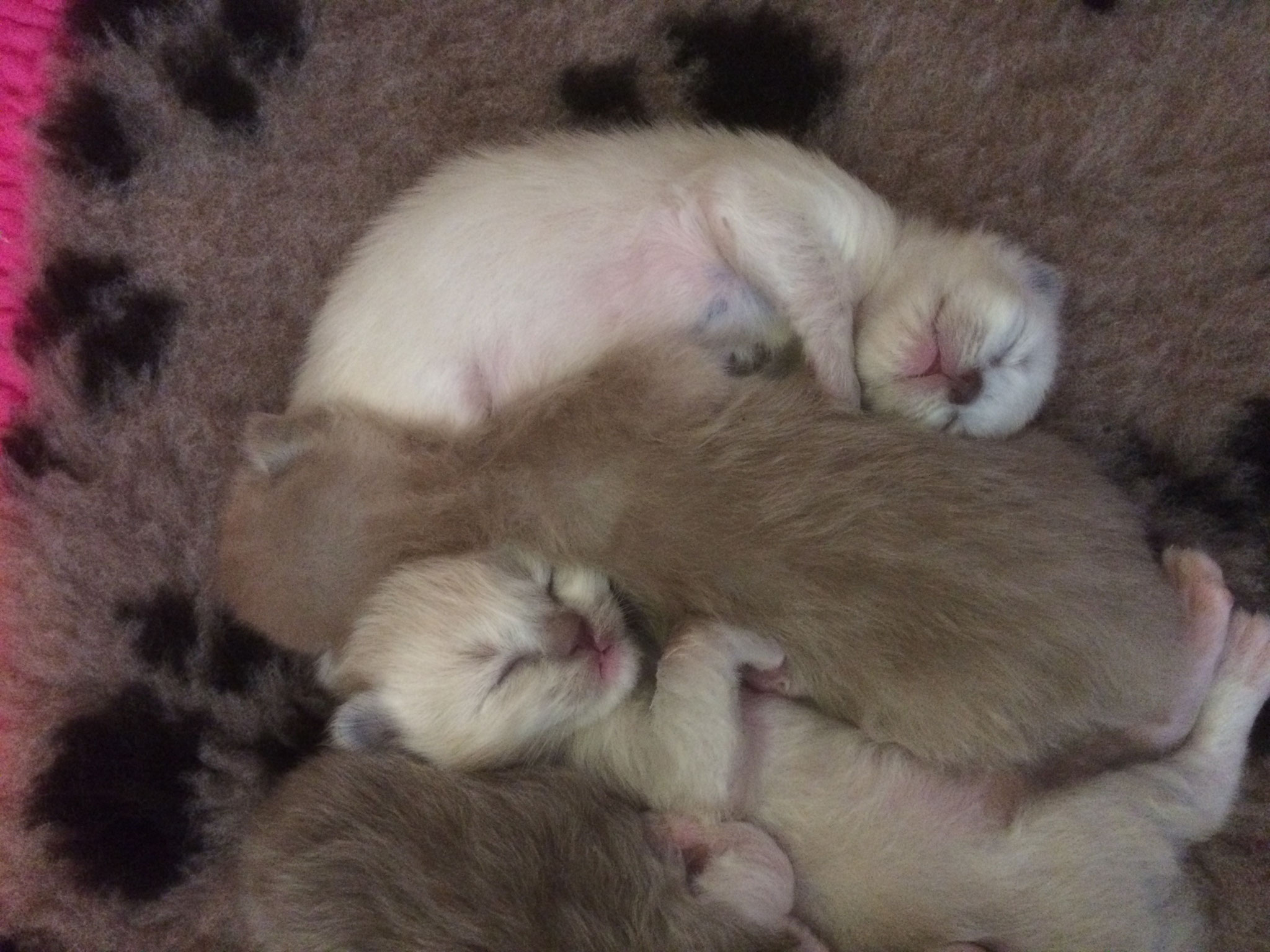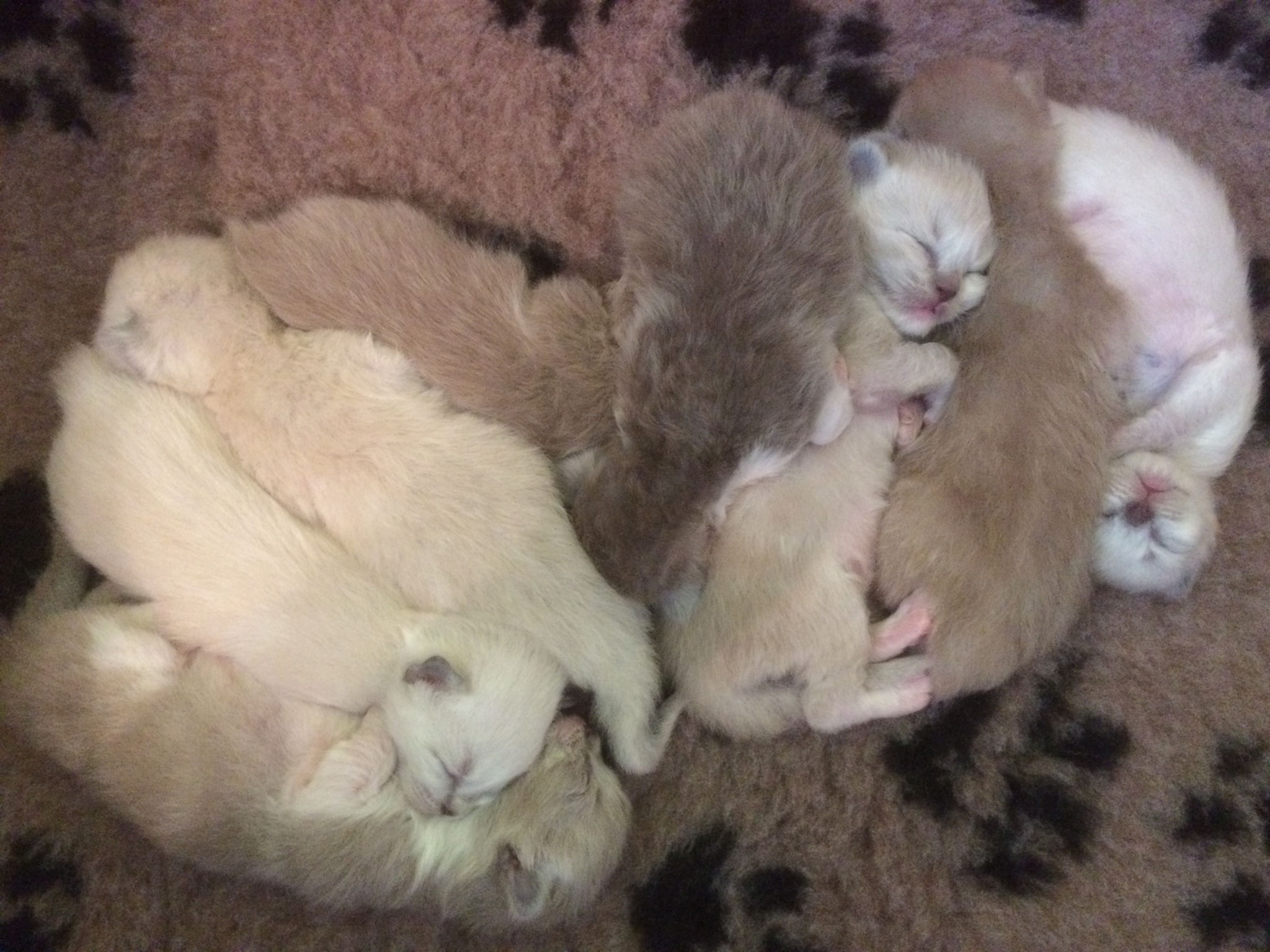 De kittens zijn vandaag 2 weken oud. Ik twijfel nog steeds over de kleur. Er zijn drie lichte kittens bij, maar die waren wel gekleurd bij de geboorte, dus ik weet niet goed wat ik ervan moet denken. Ofwel zijn ze lilac mink ofwel toch blue point. De anderen zijn blue mink denk ik en er zit één donkere bij dus dat zal een blue sepia zijn.