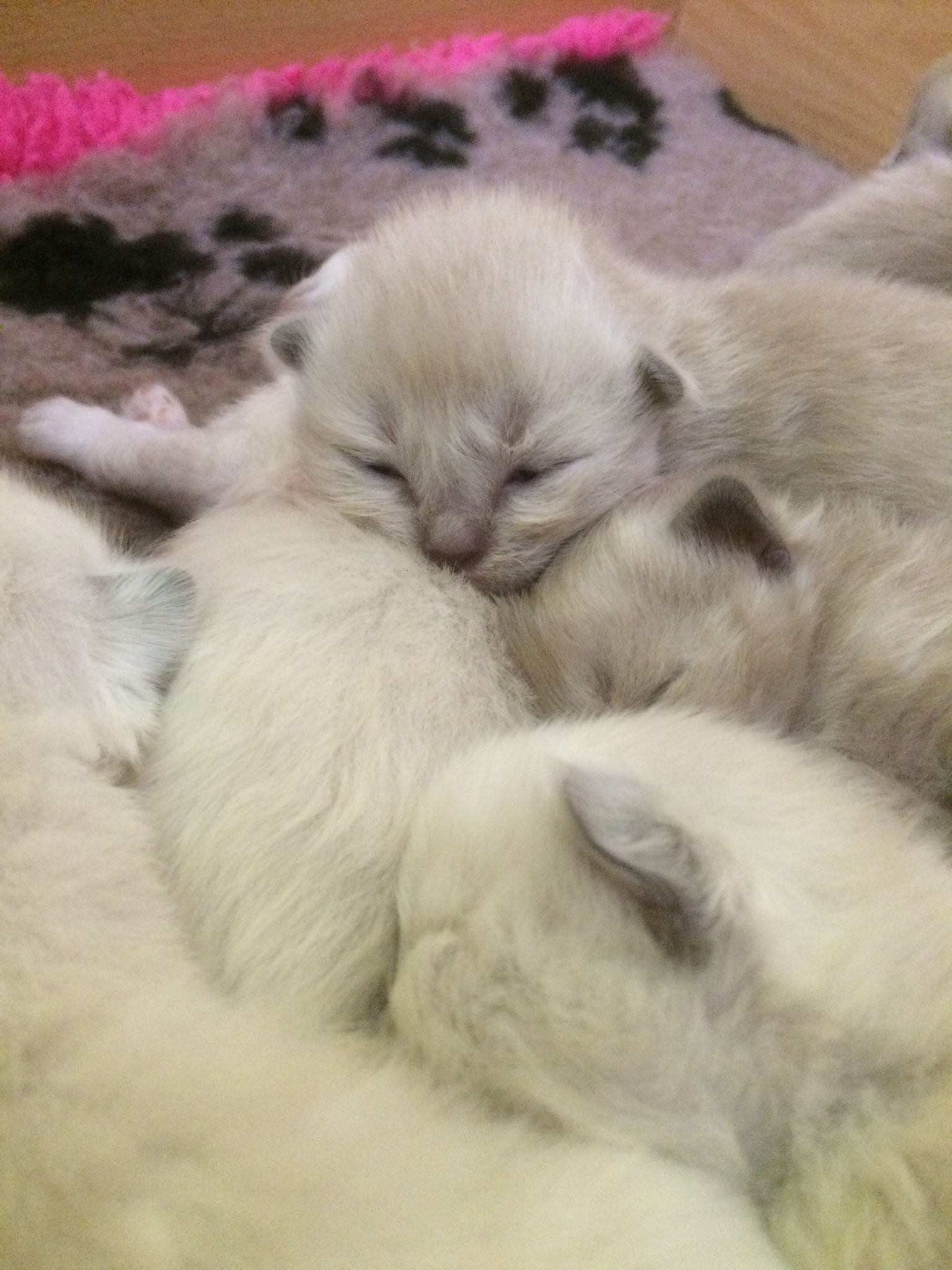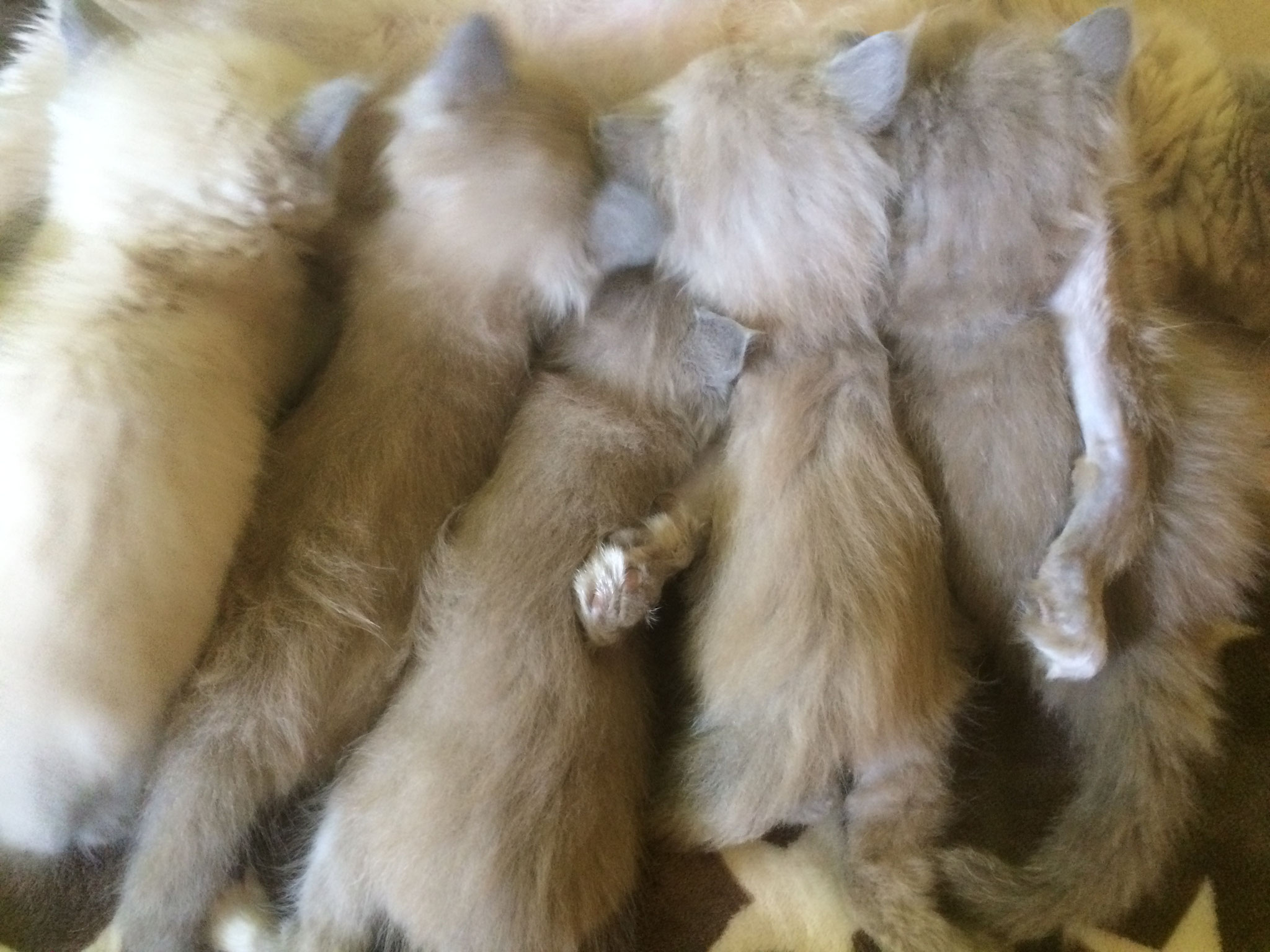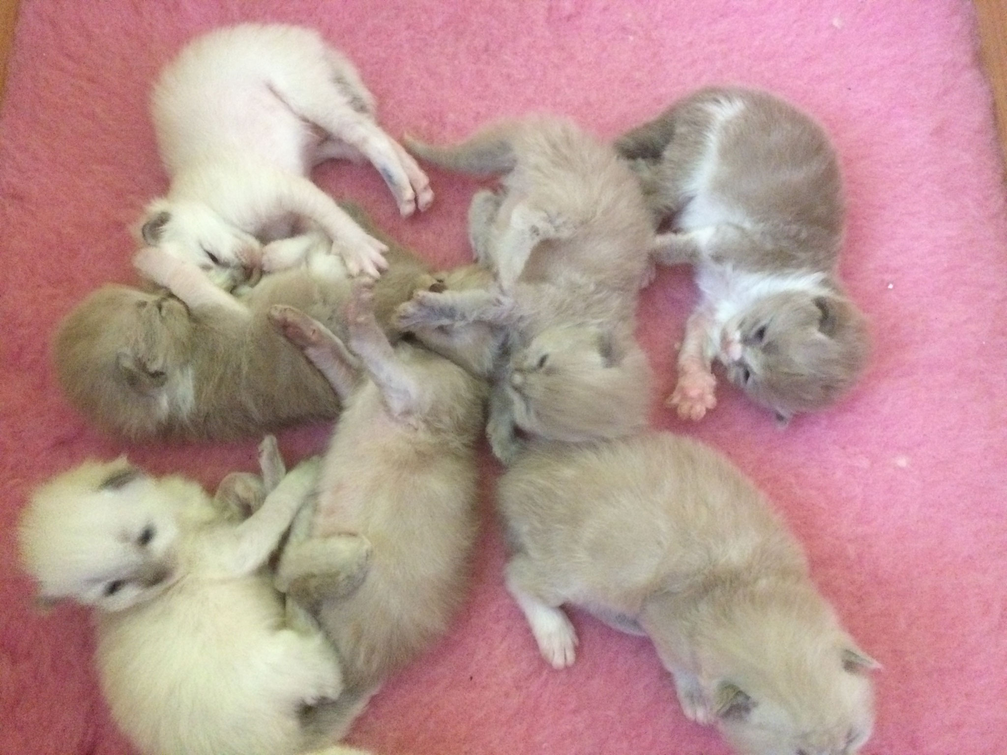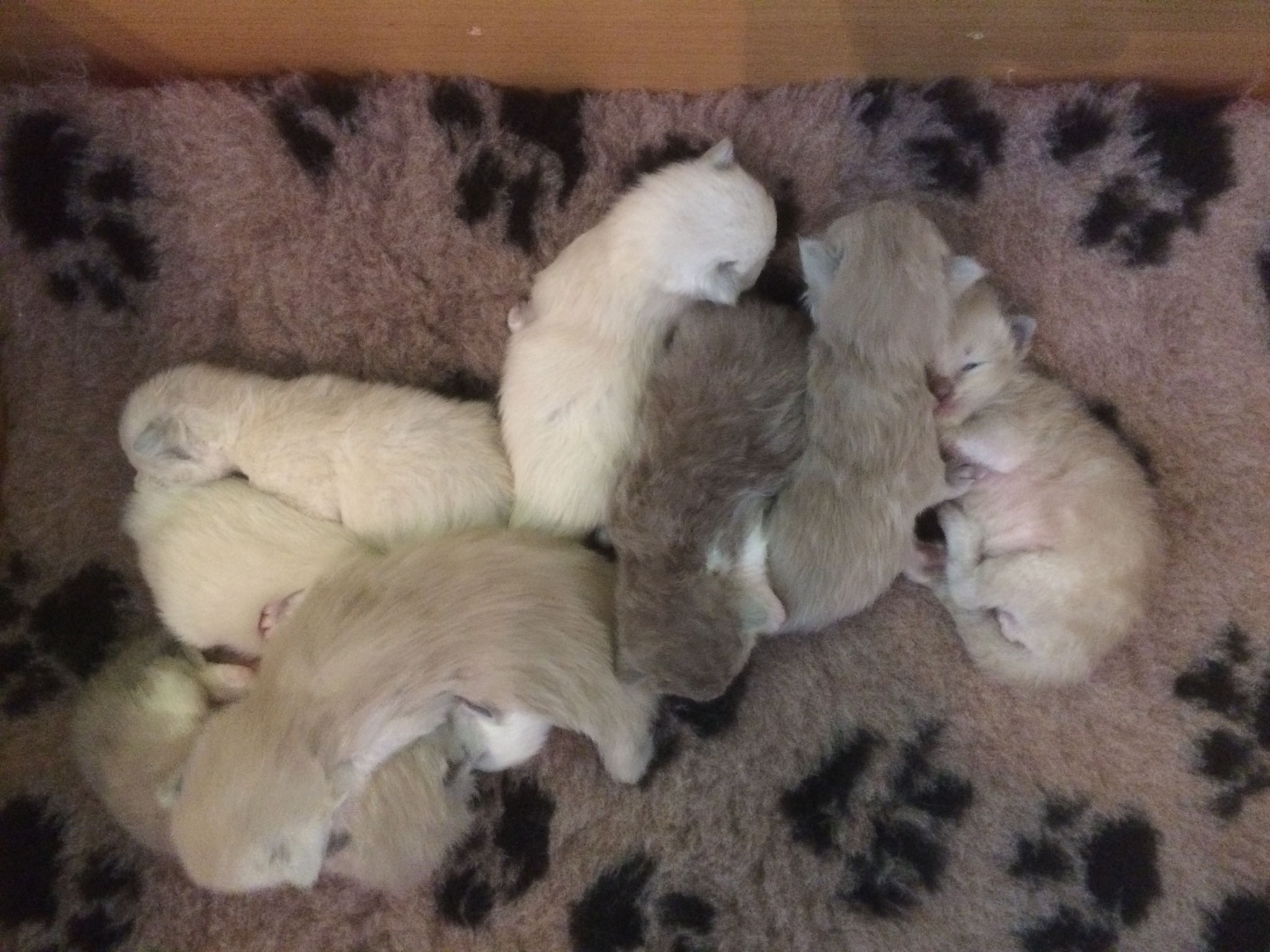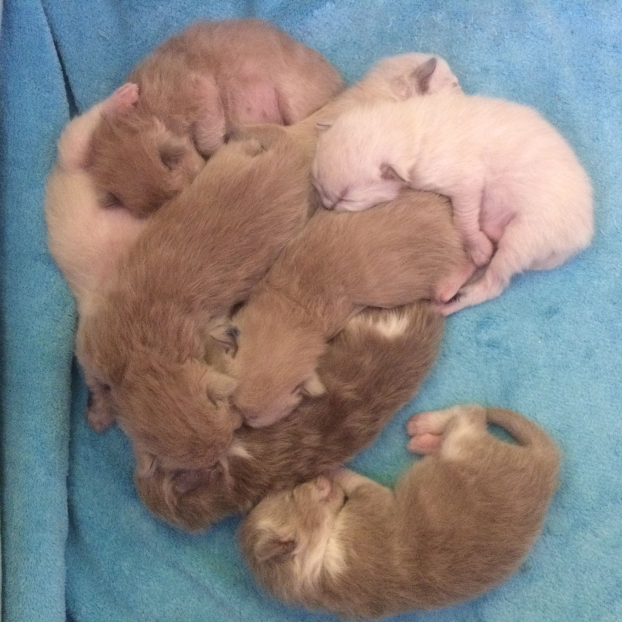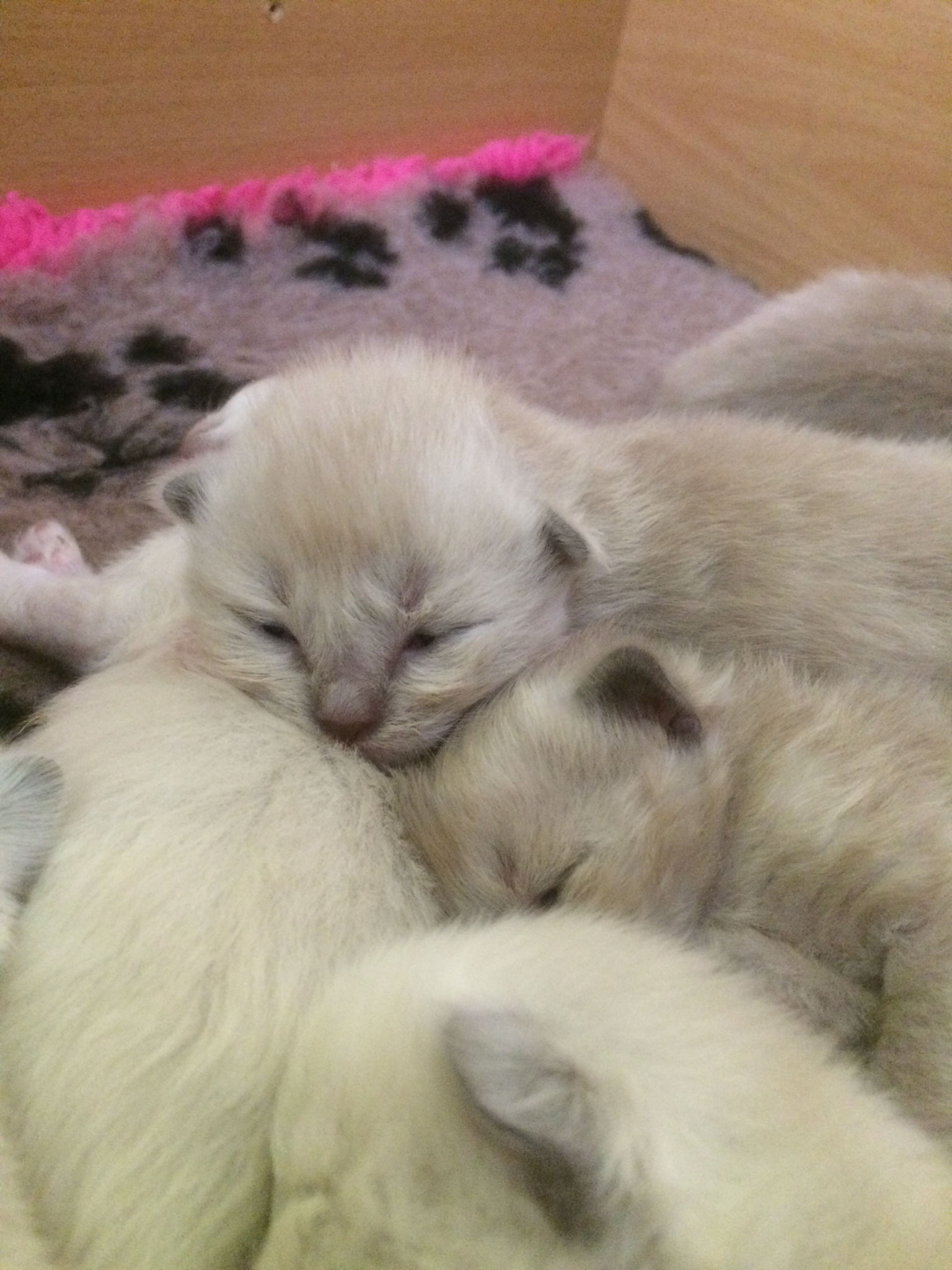 De kittens zijn vandaag 2 weken oud. Ik twijfel nog steeds over de kleur. Er zijn drie lichte kittens bij, maar die waren wel gekleurd bij de geboorte, dus ik weet niet goed wat ik ervan moet denken. Ofwel zijn ze lilac mink ofwel toch blue point. De anderen zijn blue mink denk ik en er zit één donkere bij dus dat zal een blue sepia zijn.