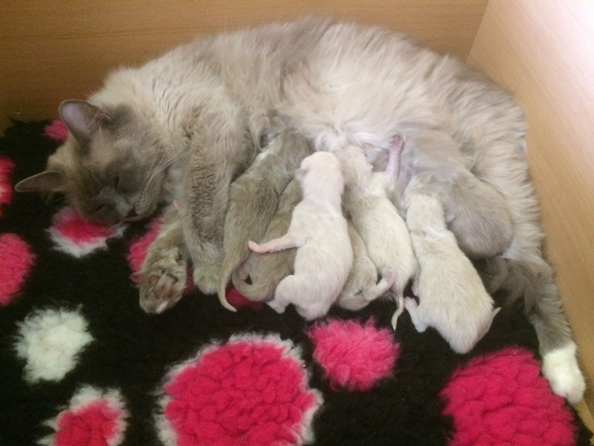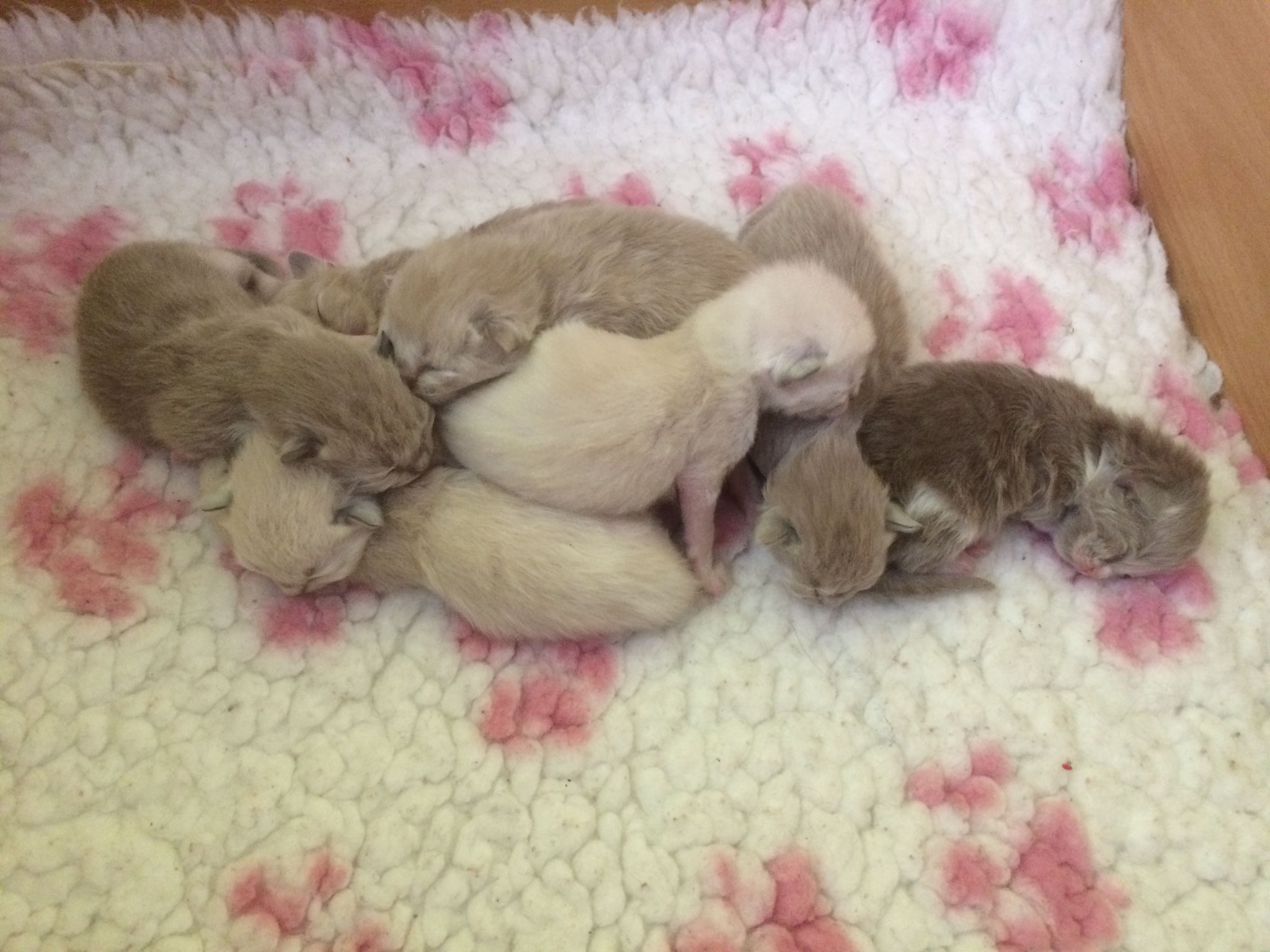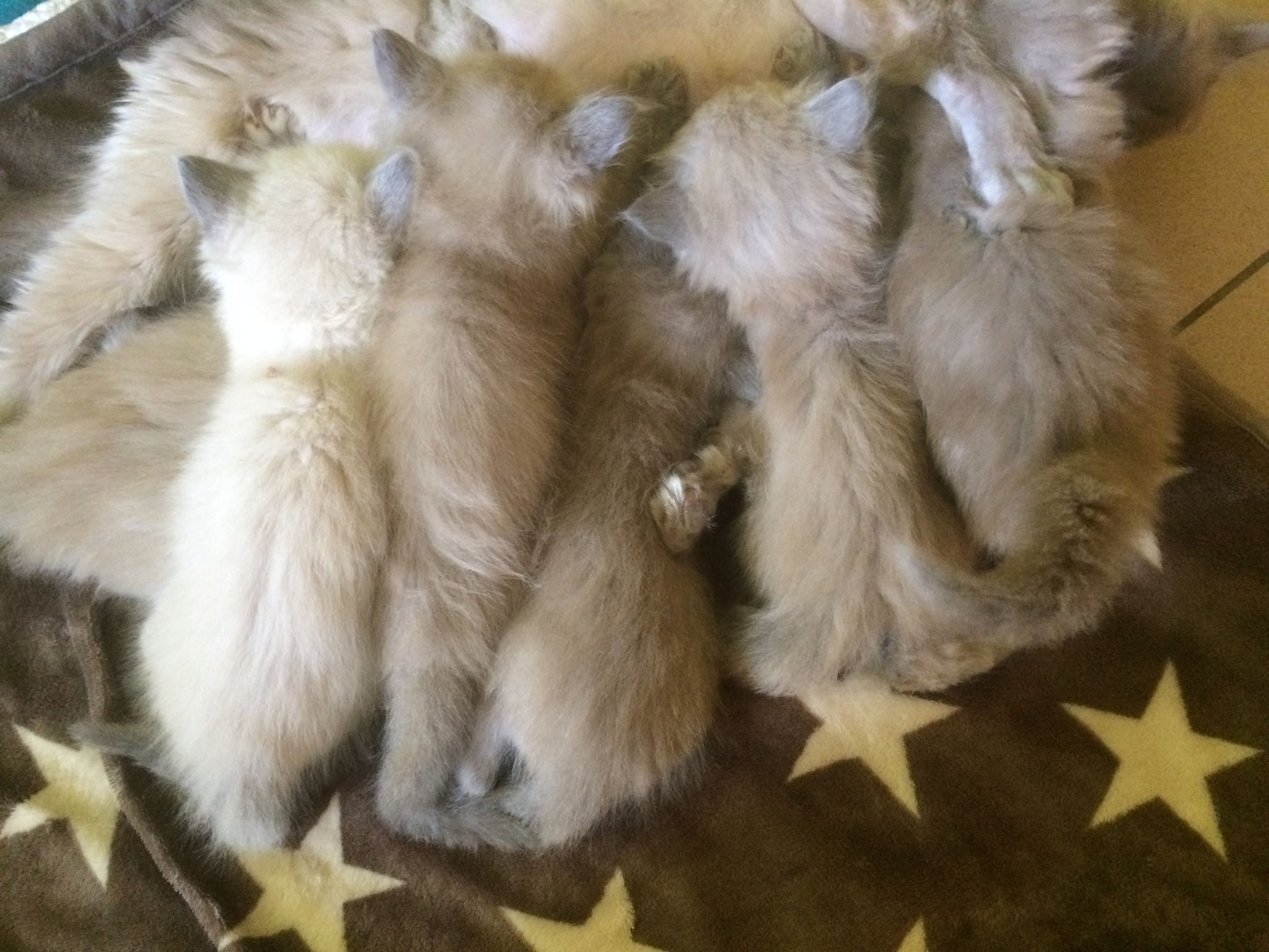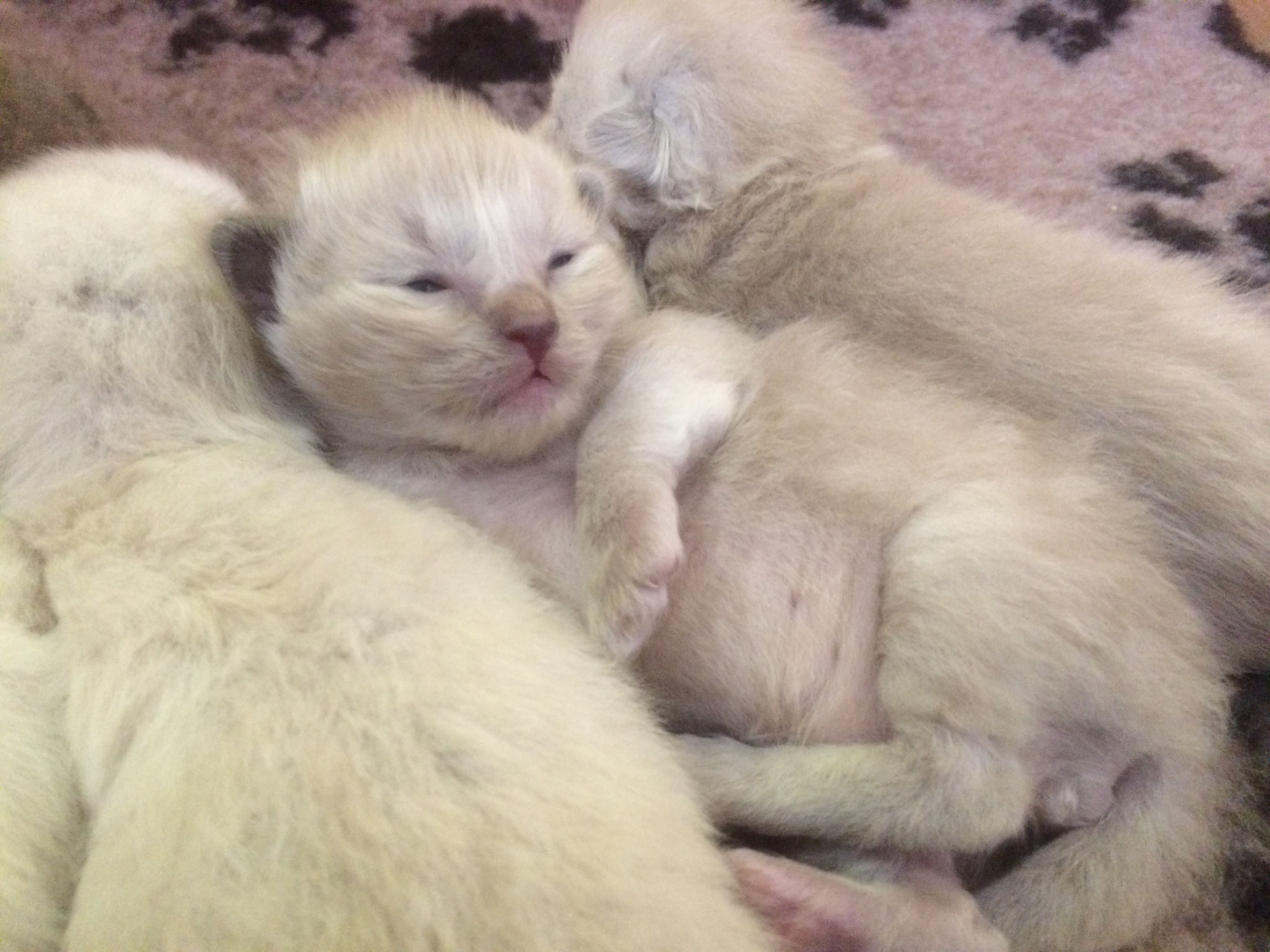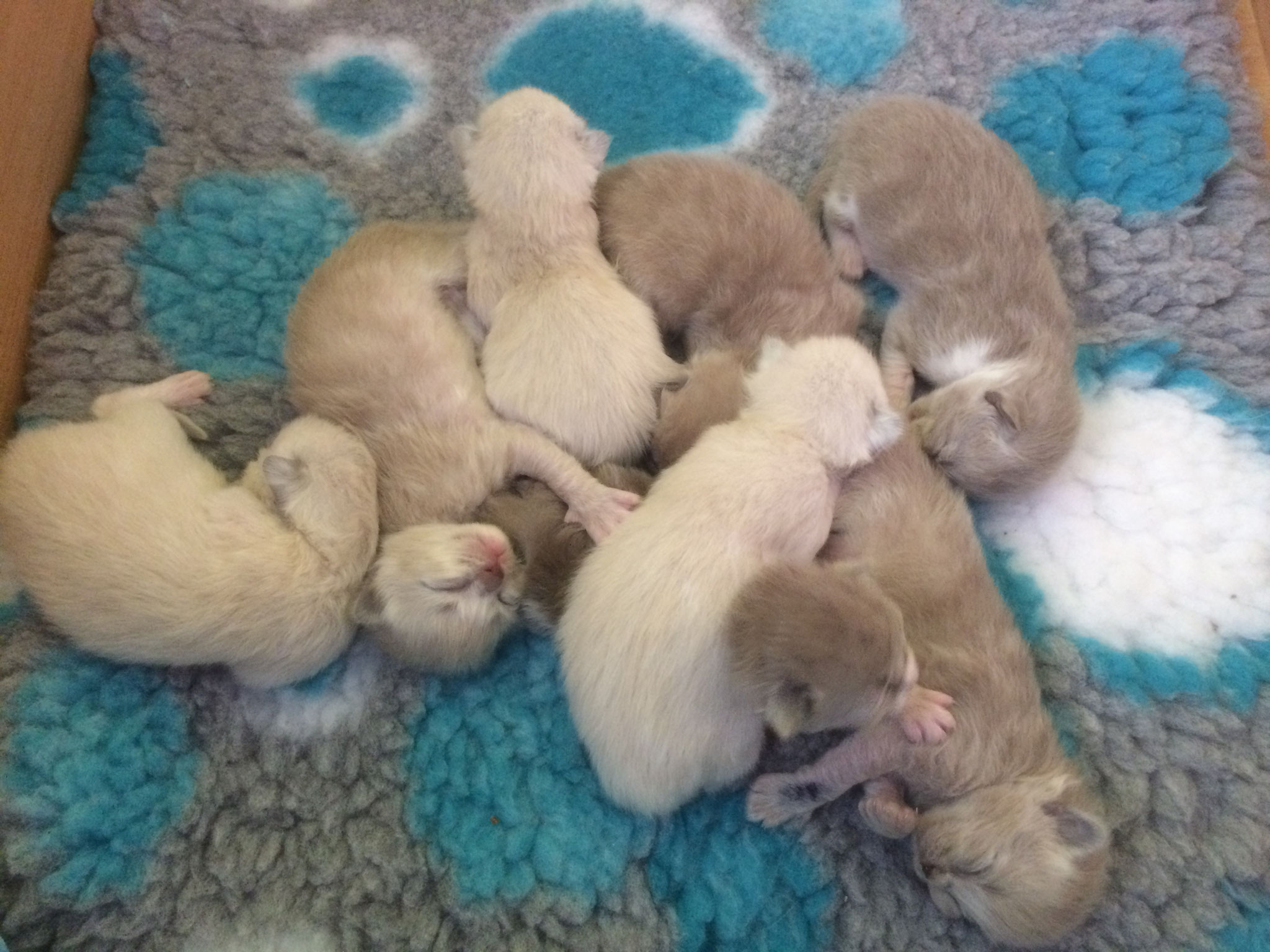 De kittens zijn vandaag 2 weken oud. Ik twijfel nog steeds over de kleur. Er zijn drie lichte kittens bij, maar die waren wel gekleurd bij de geboorte, dus ik weet niet goed wat ik ervan moet denken. Ofwel zijn ze lilac mink ofwel toch blue point. De anderen zijn blue mink denk ik en er zit één donkere bij dus dat zal een blue sepia zijn.