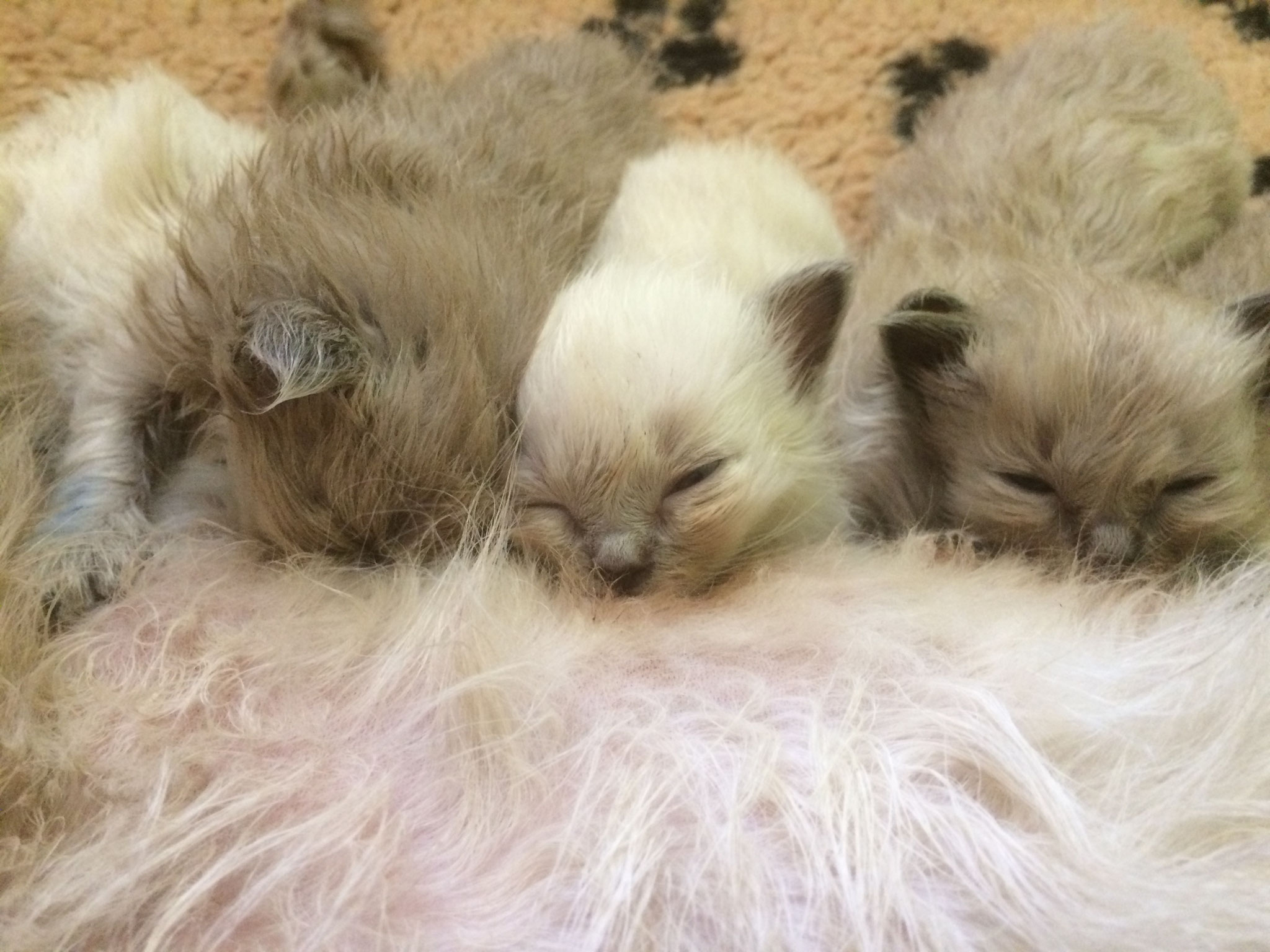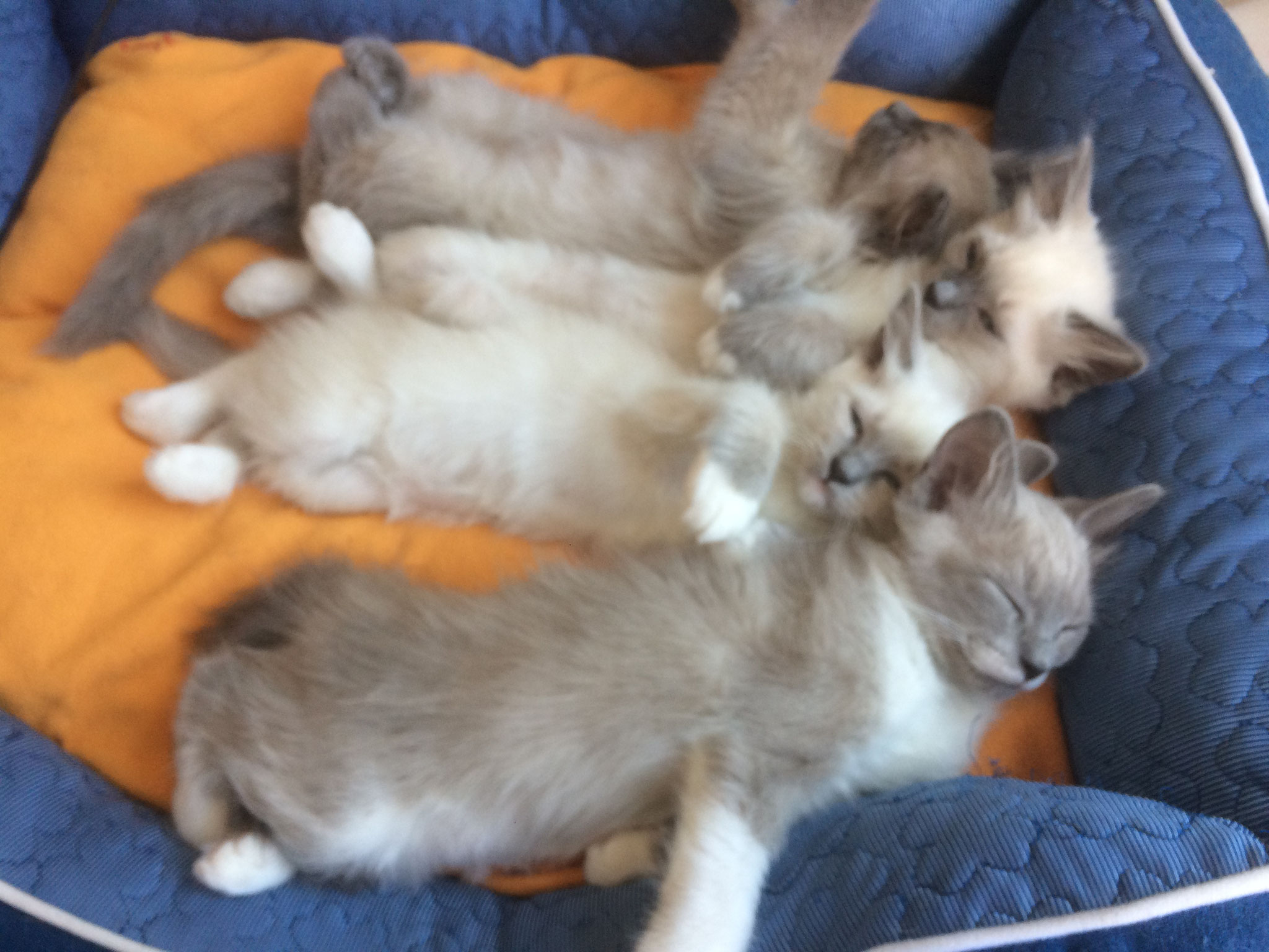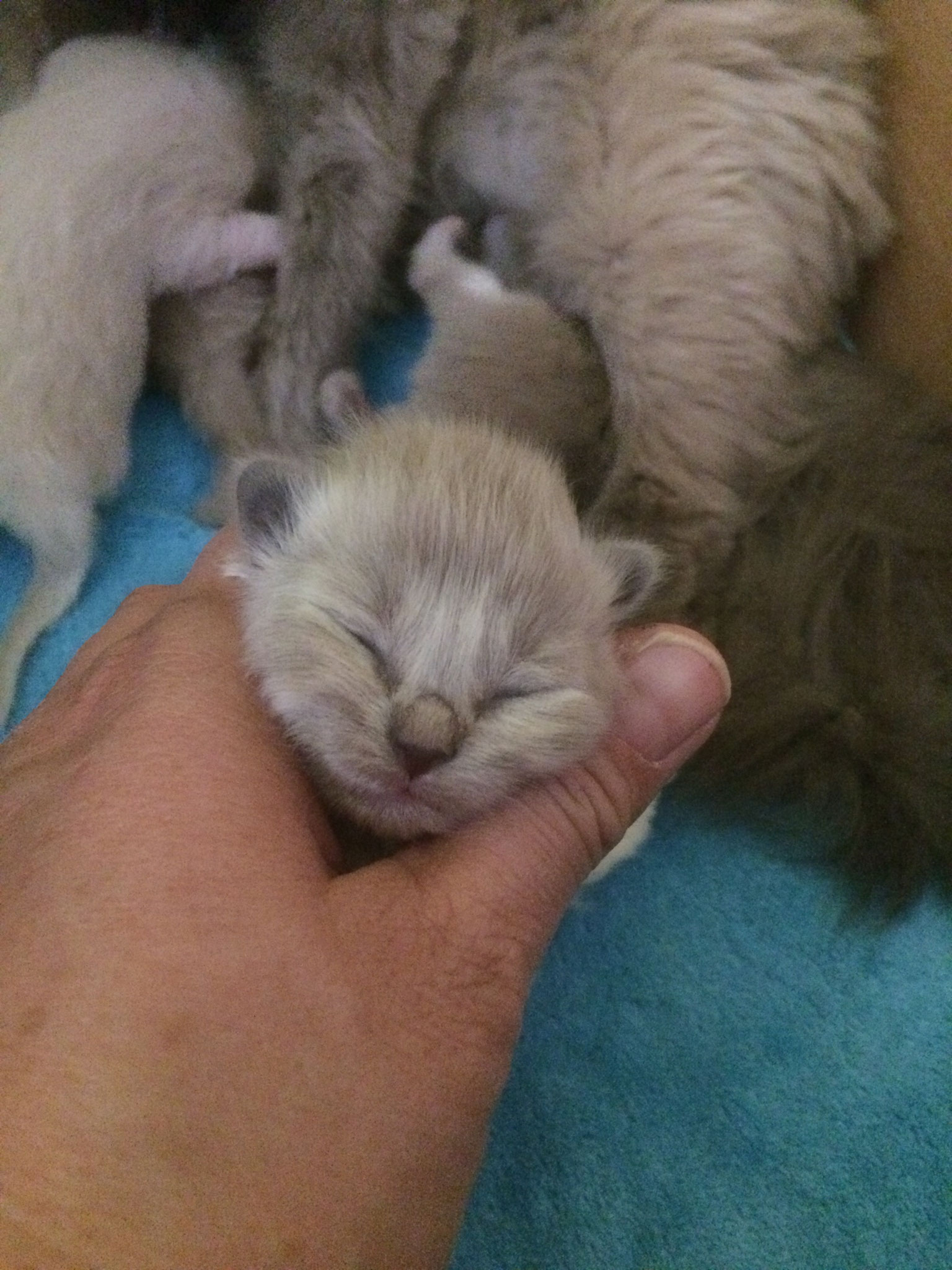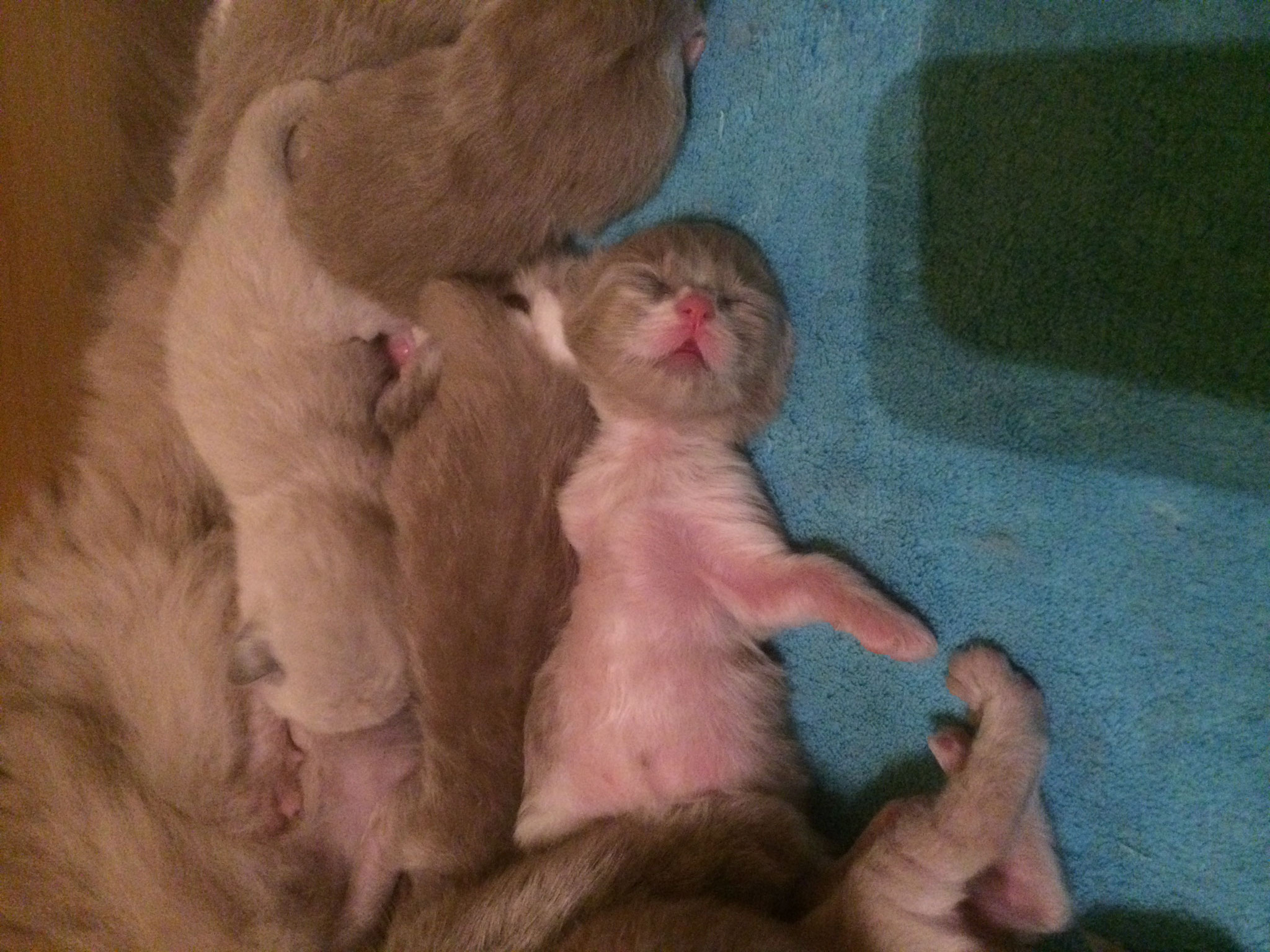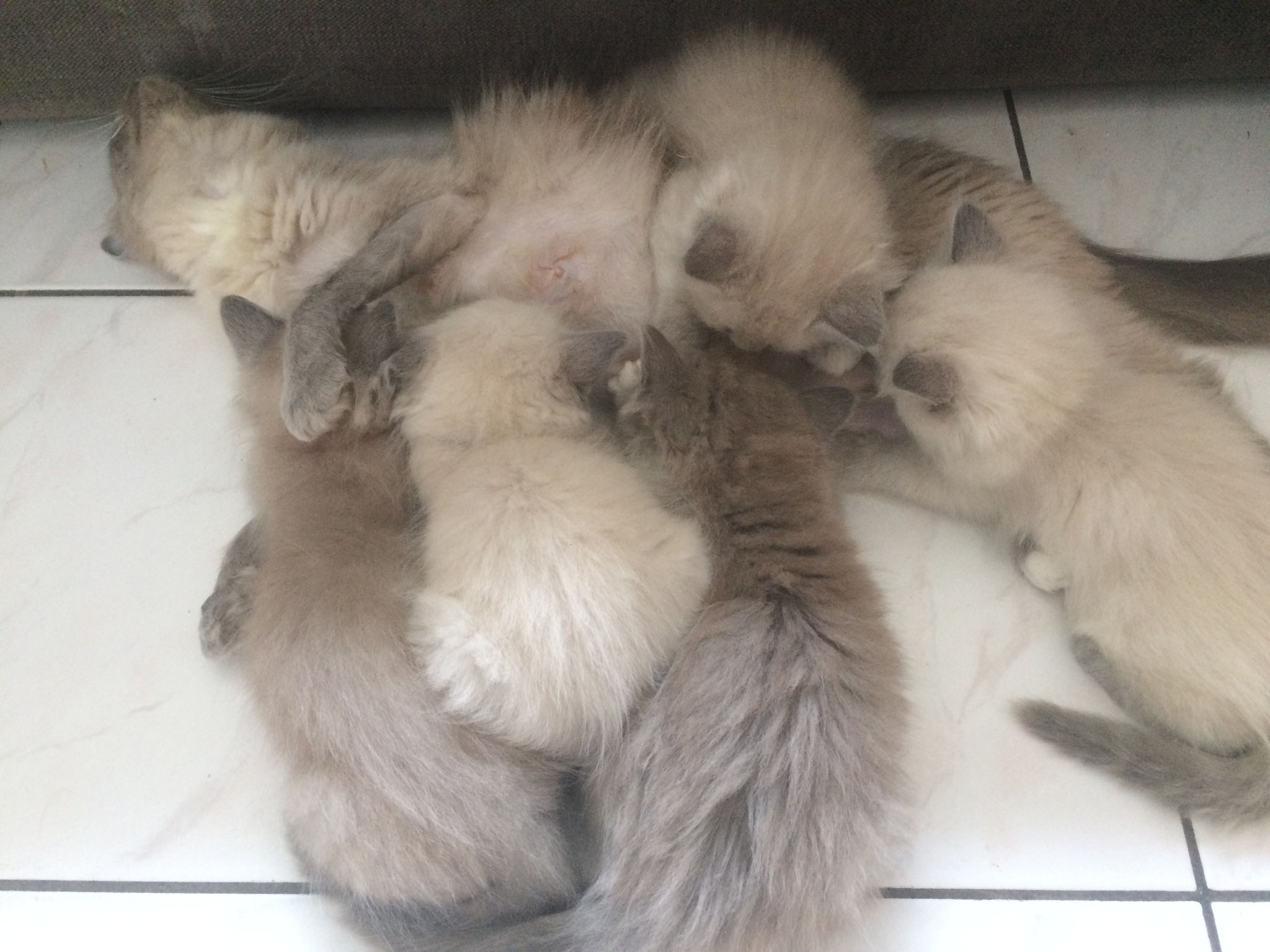 De kittens zijn vandaag 2 weken oud. Ik twijfel nog steeds over de kleur. Er zijn drie lichte kittens bij, maar die waren wel gekleurd bij de geboorte, dus ik weet niet goed wat ik ervan moet denken. Ofwel zijn ze lilac mink ofwel toch blue point. De anderen zijn blue mink denk ik en er zit één donkere bij dus dat zal een blue sepia zijn.