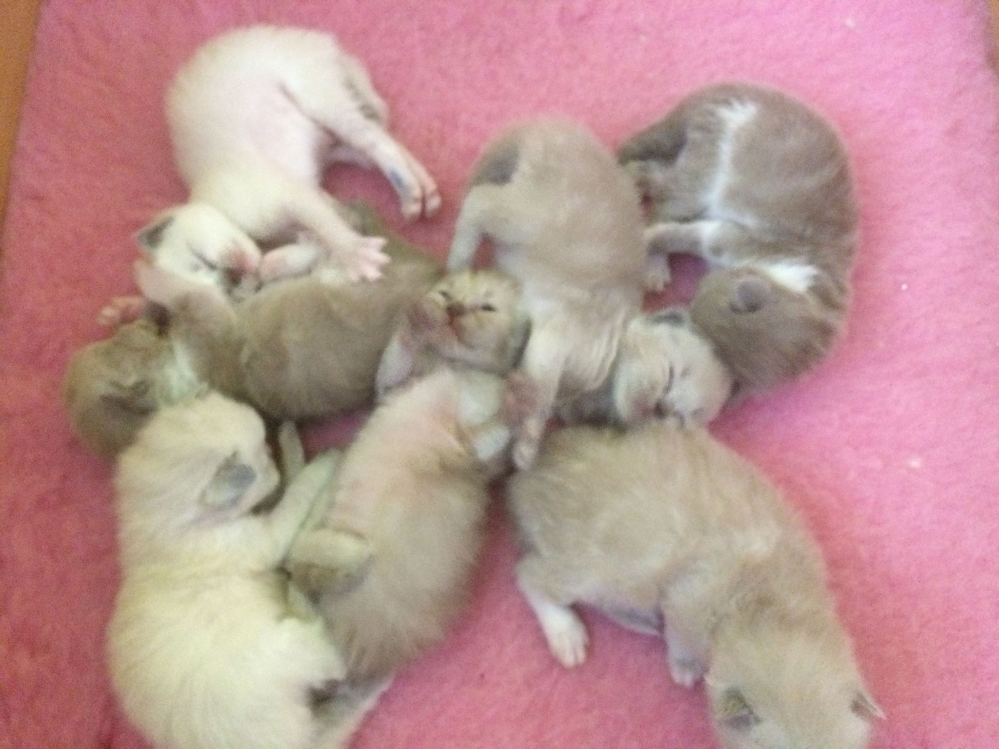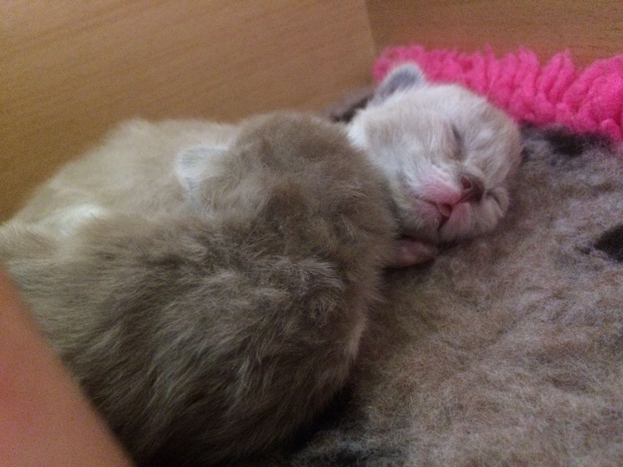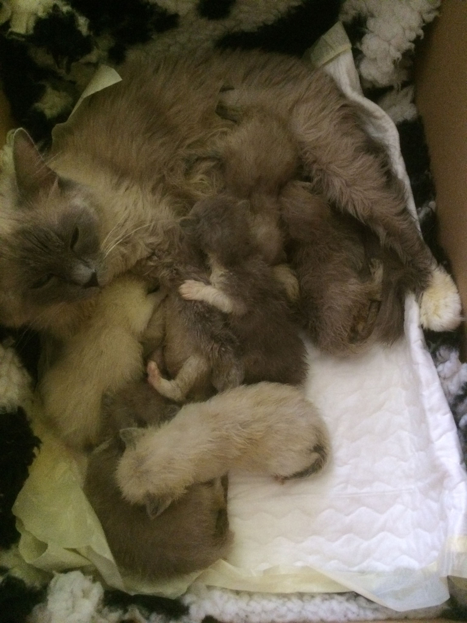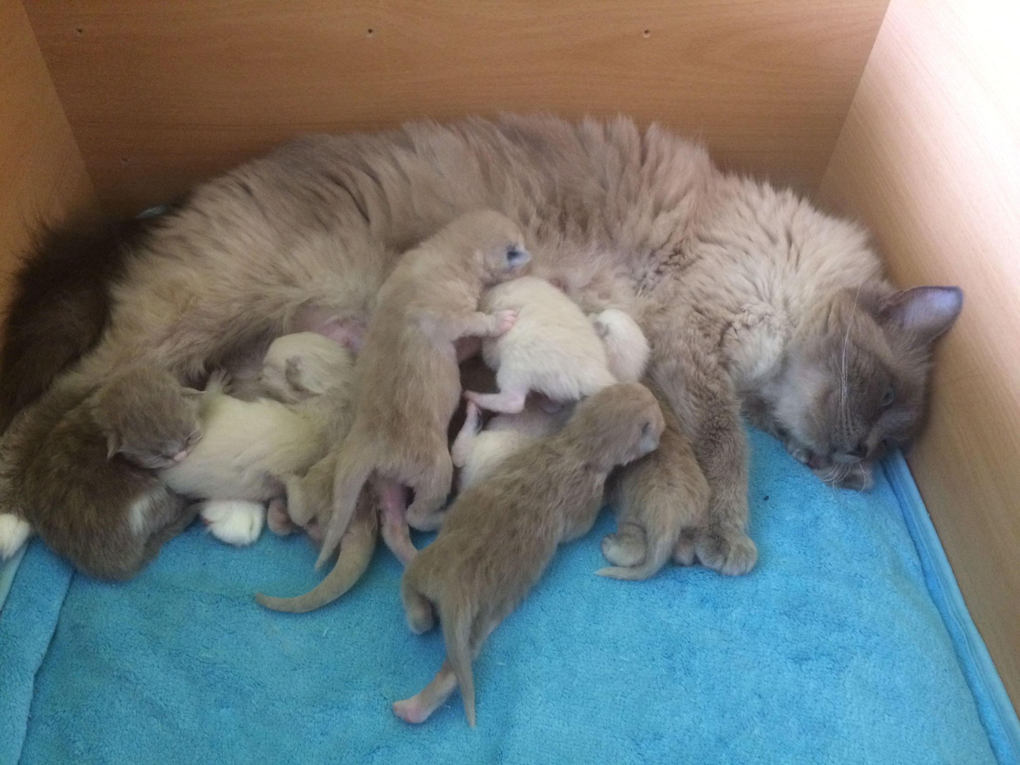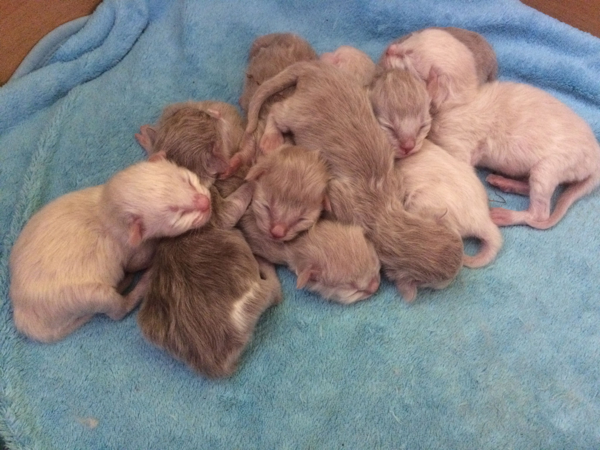 De kittens zijn vandaag 2 weken oud. Ik twijfel nog steeds over de kleur. Er zijn drie lichte kittens bij, maar die waren wel gekleurd bij de geboorte, dus ik weet niet goed wat ik ervan moet denken. Ofwel zijn ze lilac mink ofwel toch blue point. De anderen zijn blue mink denk ik en er zit één donkere bij dus dat zal een blue sepia zijn.