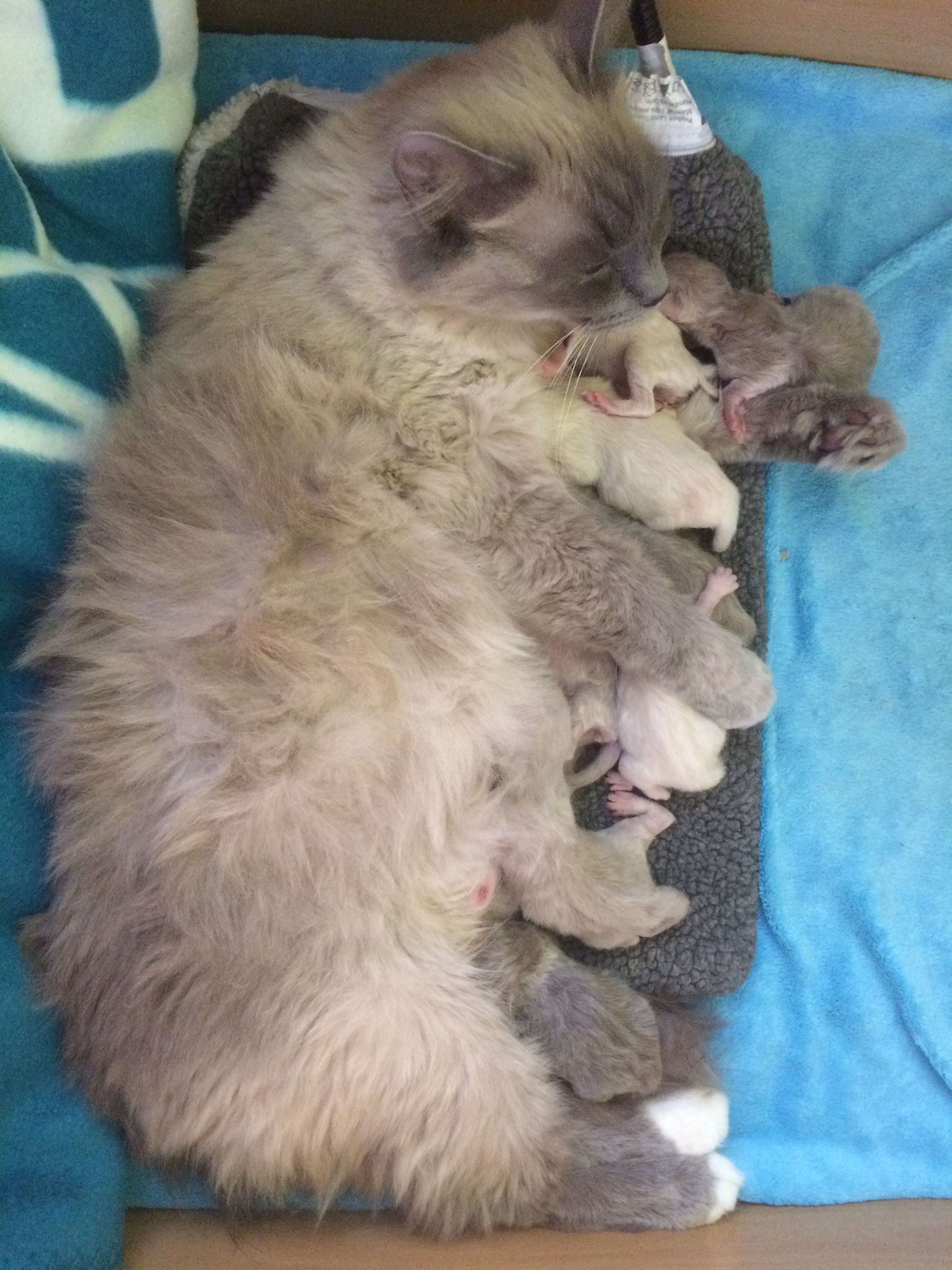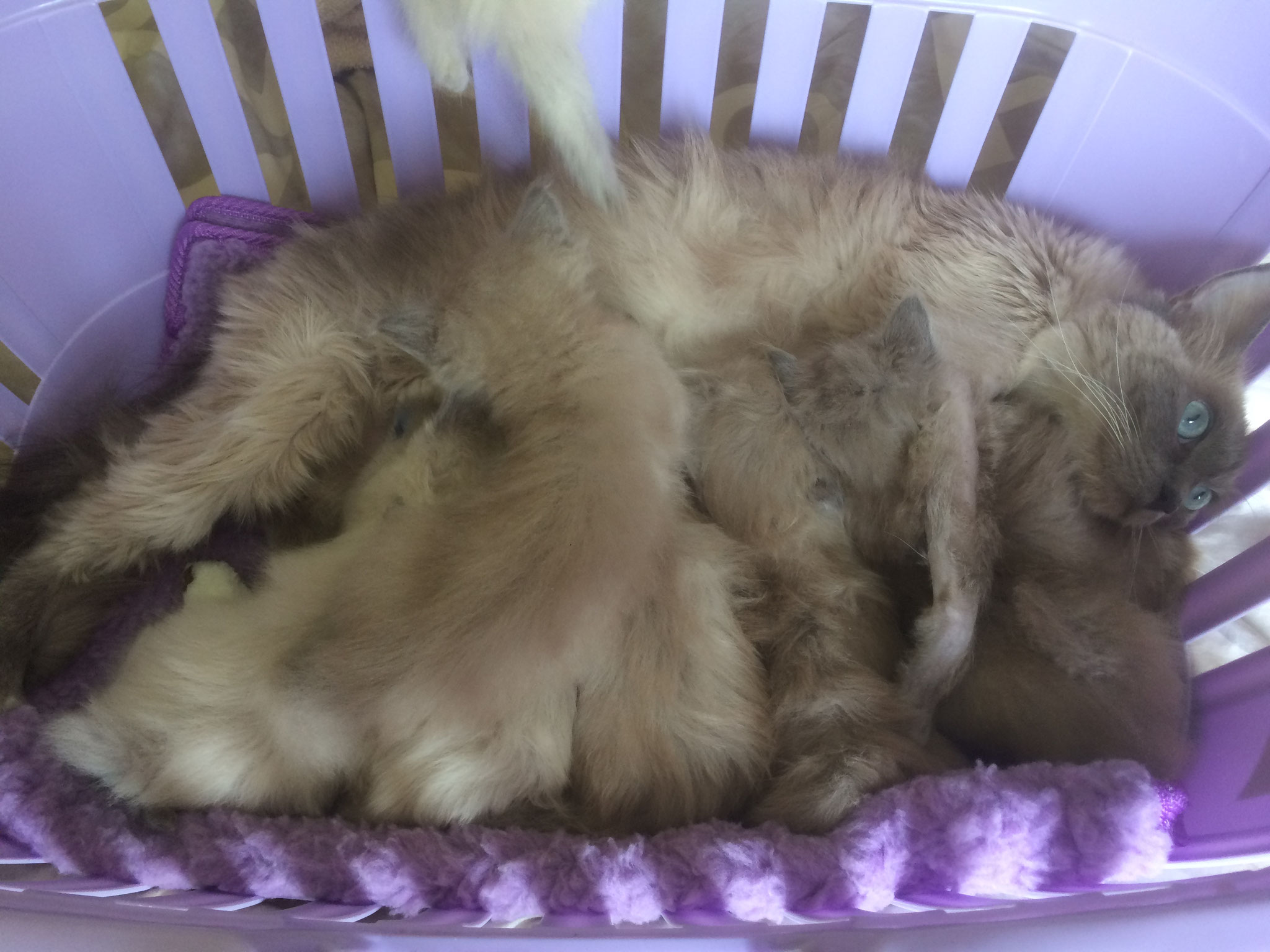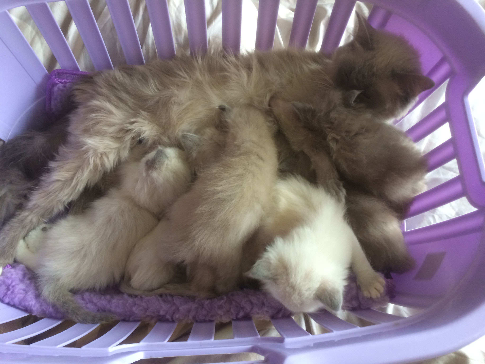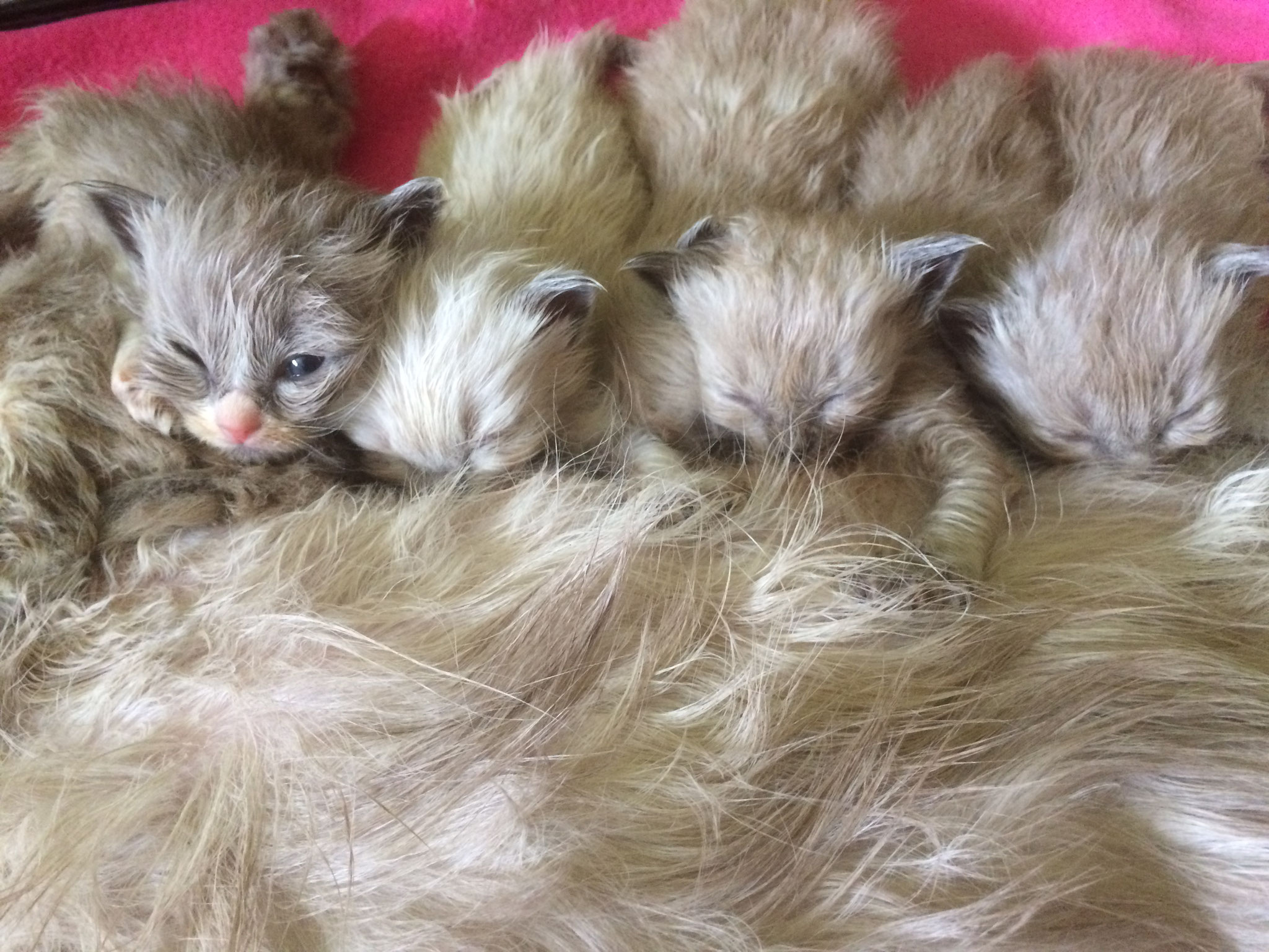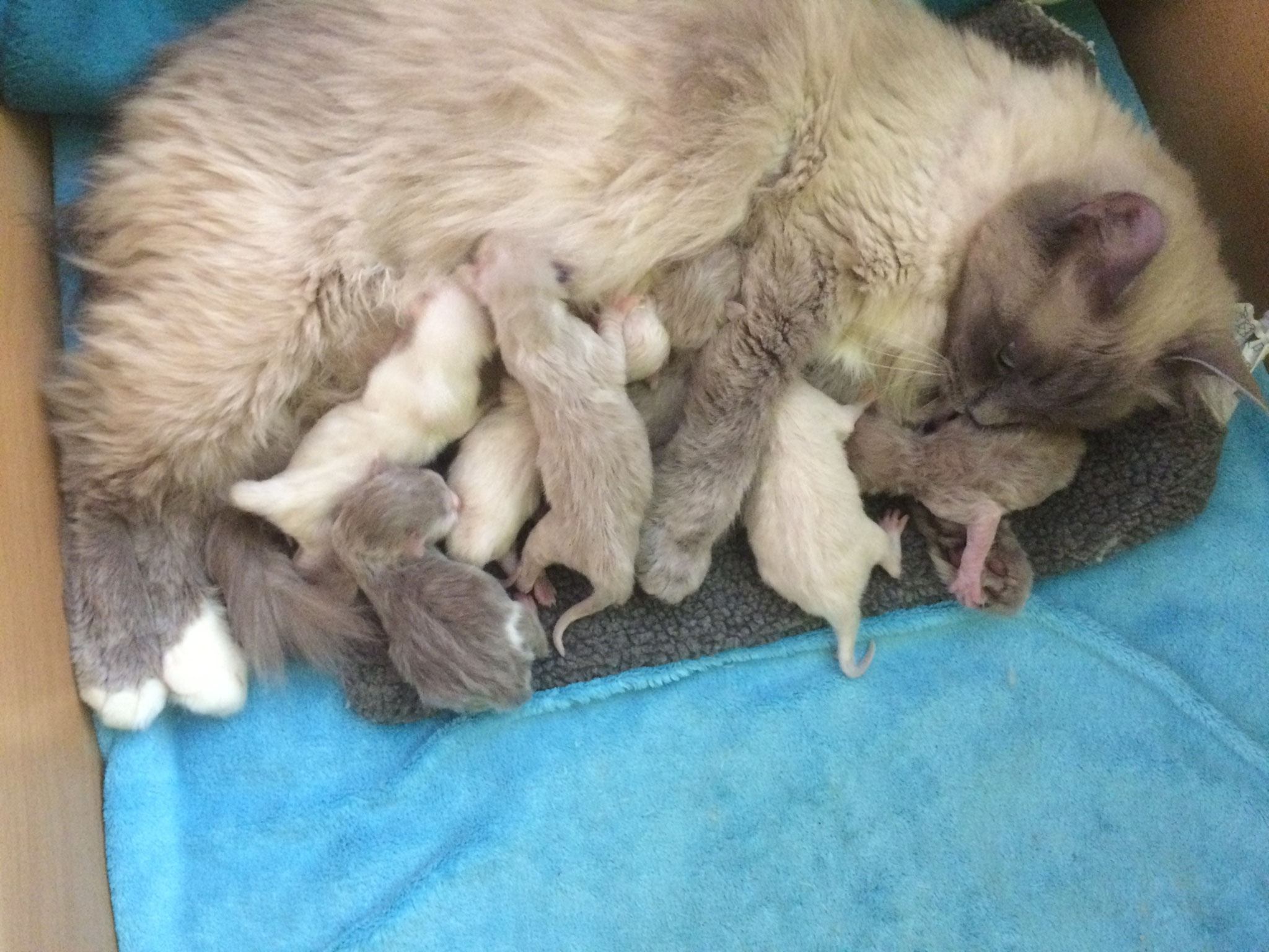 De kittens zijn vandaag 2 weken oud. Ik twijfel nog steeds over de kleur. Er zijn drie lichte kittens bij, maar die waren wel gekleurd bij de geboorte, dus ik weet niet goed wat ik ervan moet denken. Ofwel zijn ze lilac mink ofwel toch blue point. De anderen zijn blue mink denk ik en er zit één donkere bij dus dat zal een blue sepia zijn.