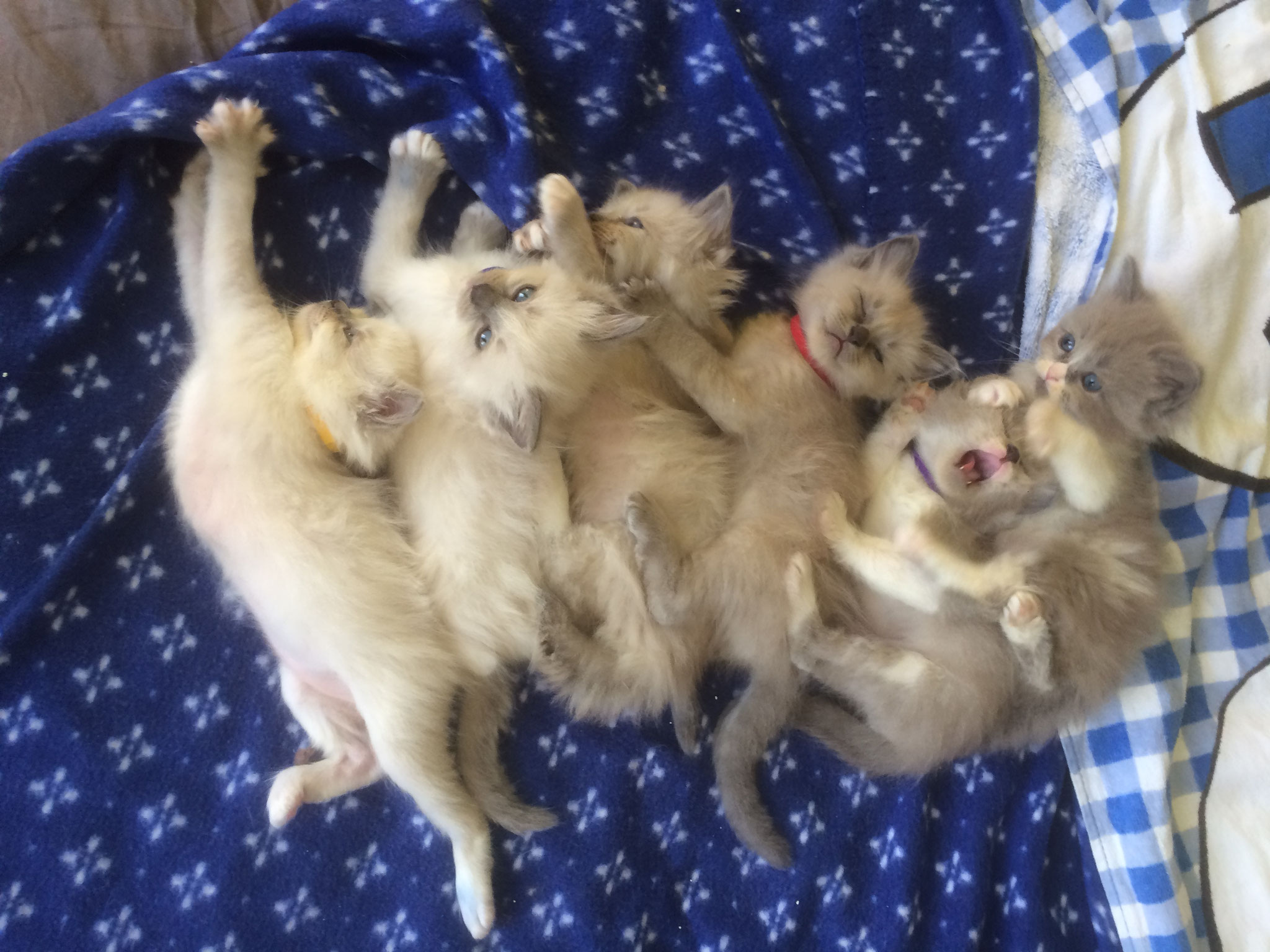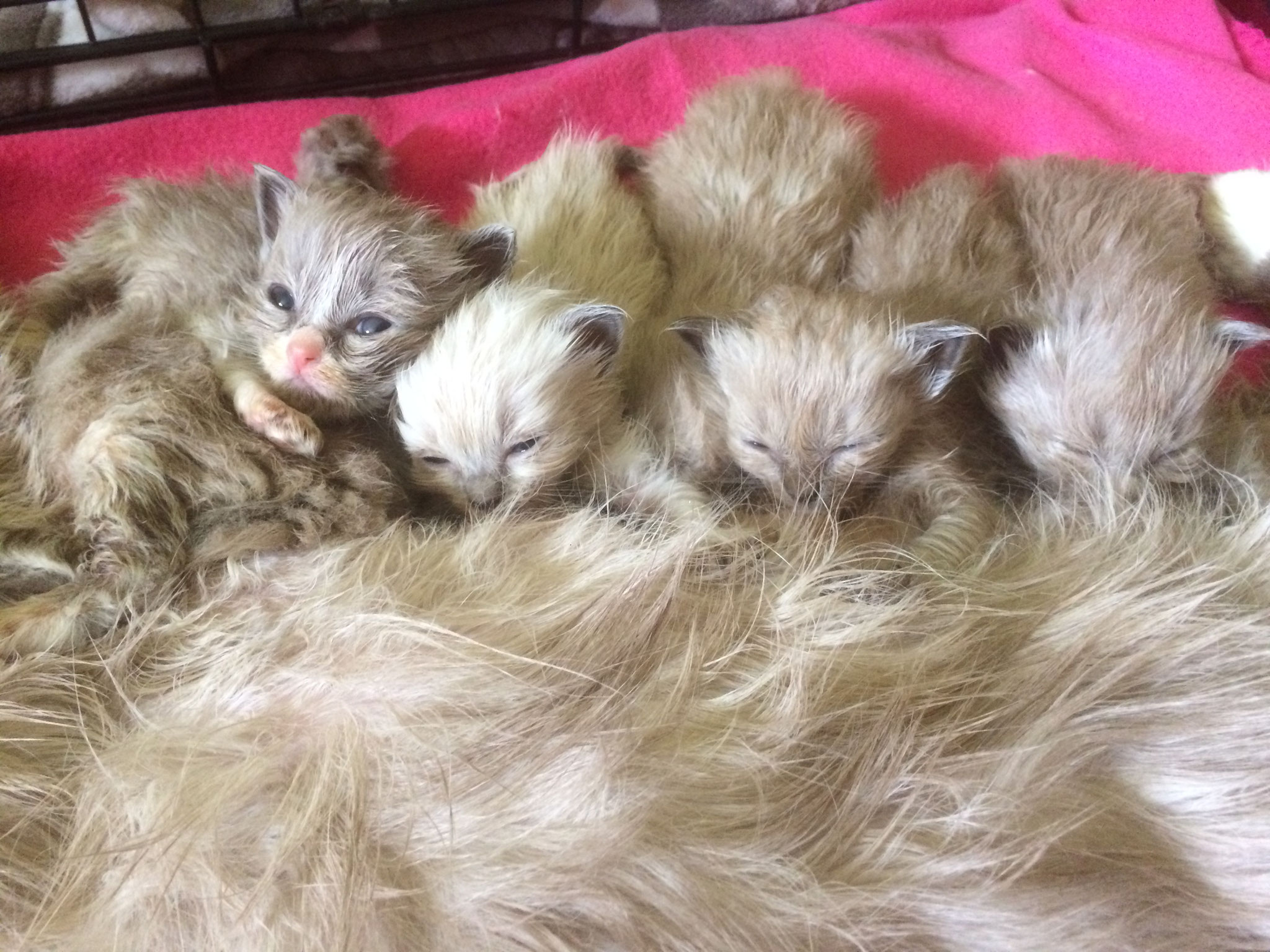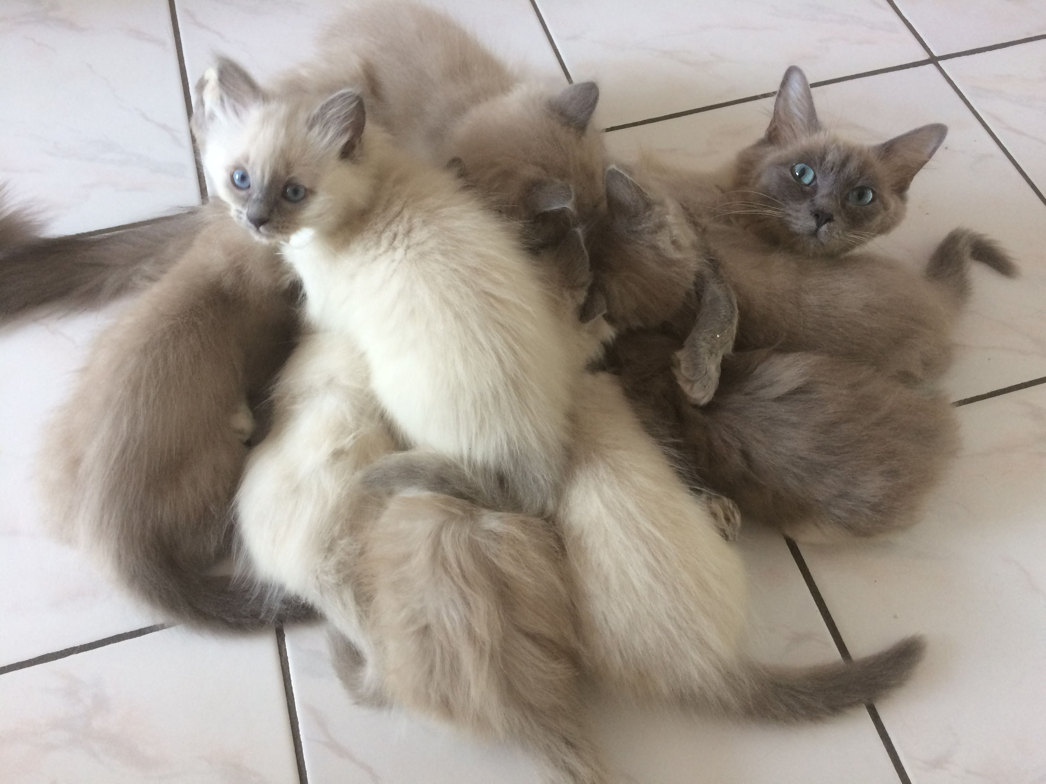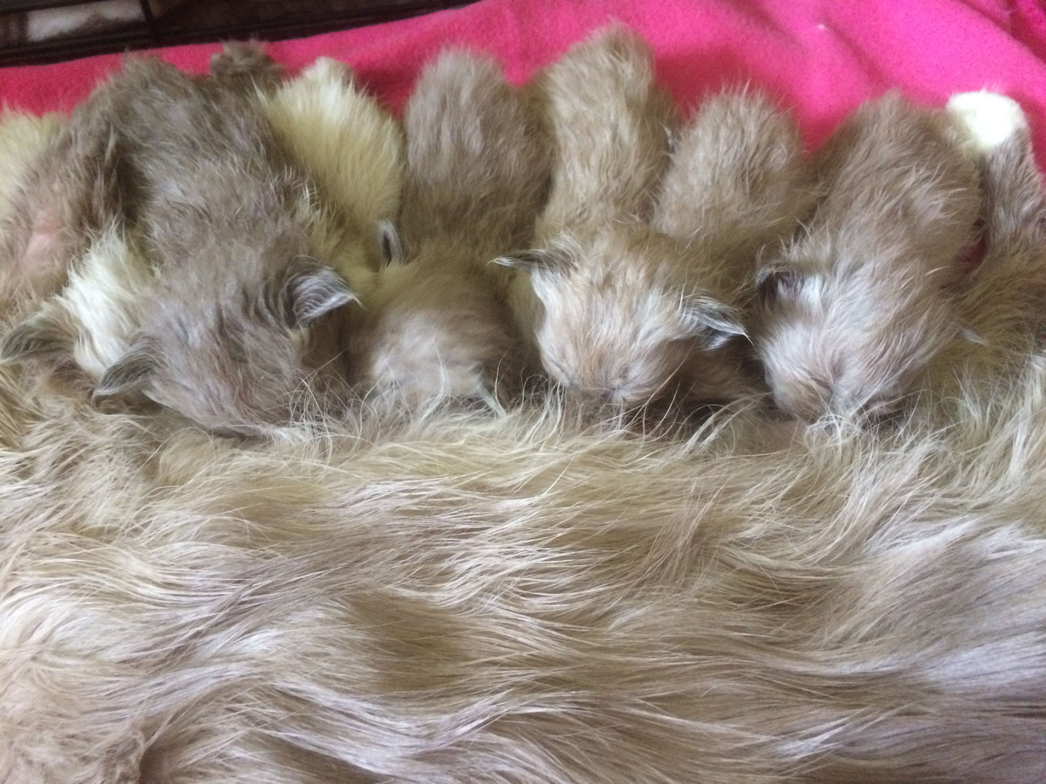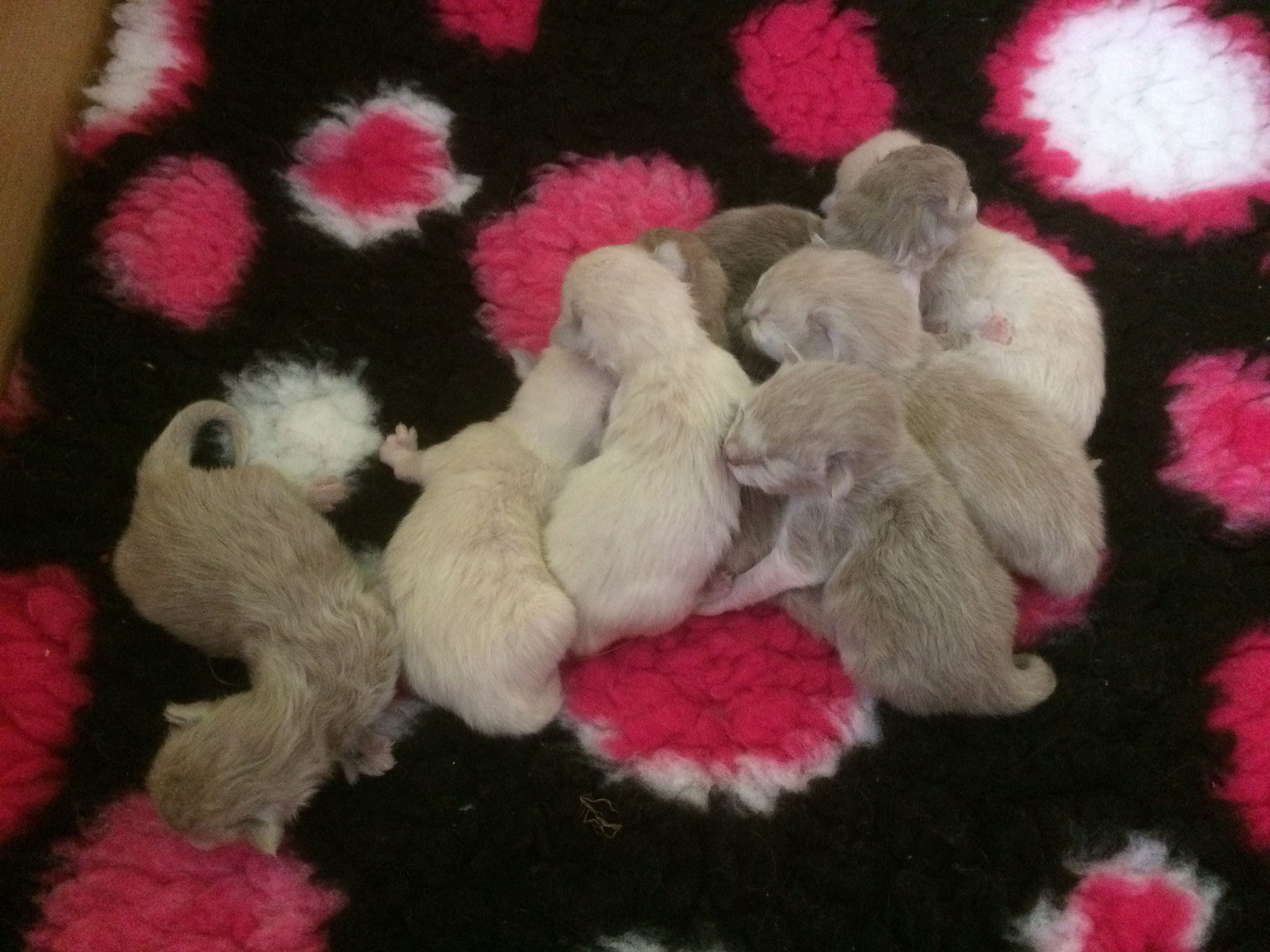 De kittens zijn vandaag 2 weken oud. Ik twijfel nog steeds over de kleur. Er zijn drie lichte kittens bij, maar die waren wel gekleurd bij de geboorte, dus ik weet niet goed wat ik ervan moet denken. Ofwel zijn ze lilac mink ofwel toch blue point. De anderen zijn blue mink denk ik en er zit één donkere bij dus dat zal een blue sepia zijn.