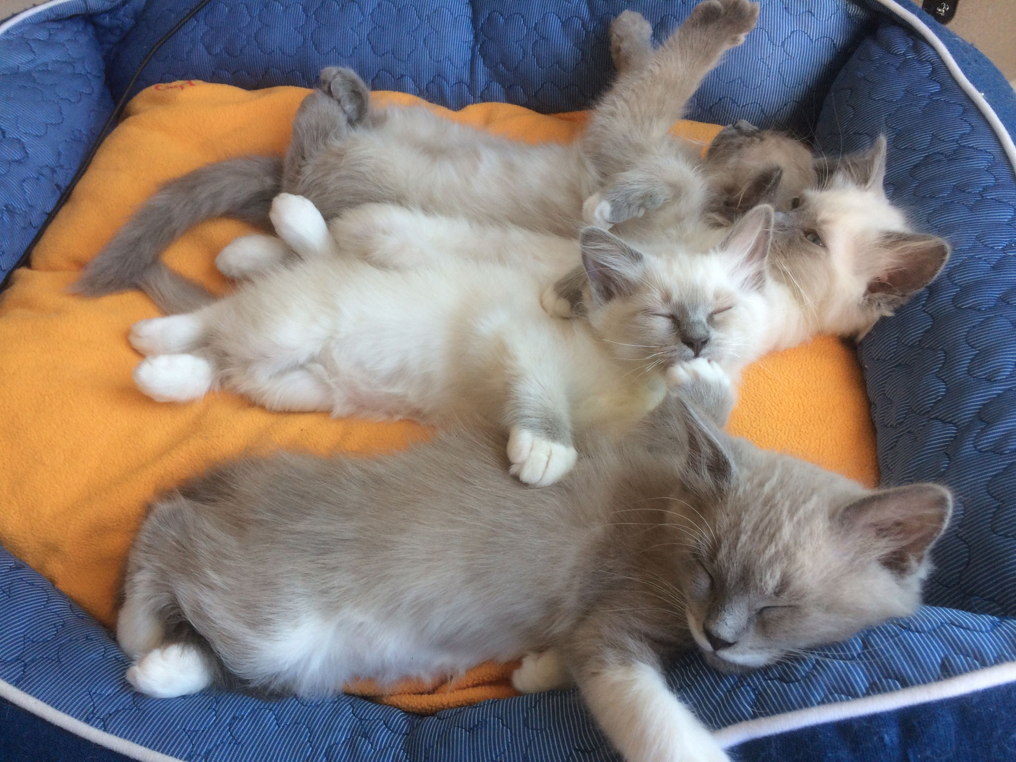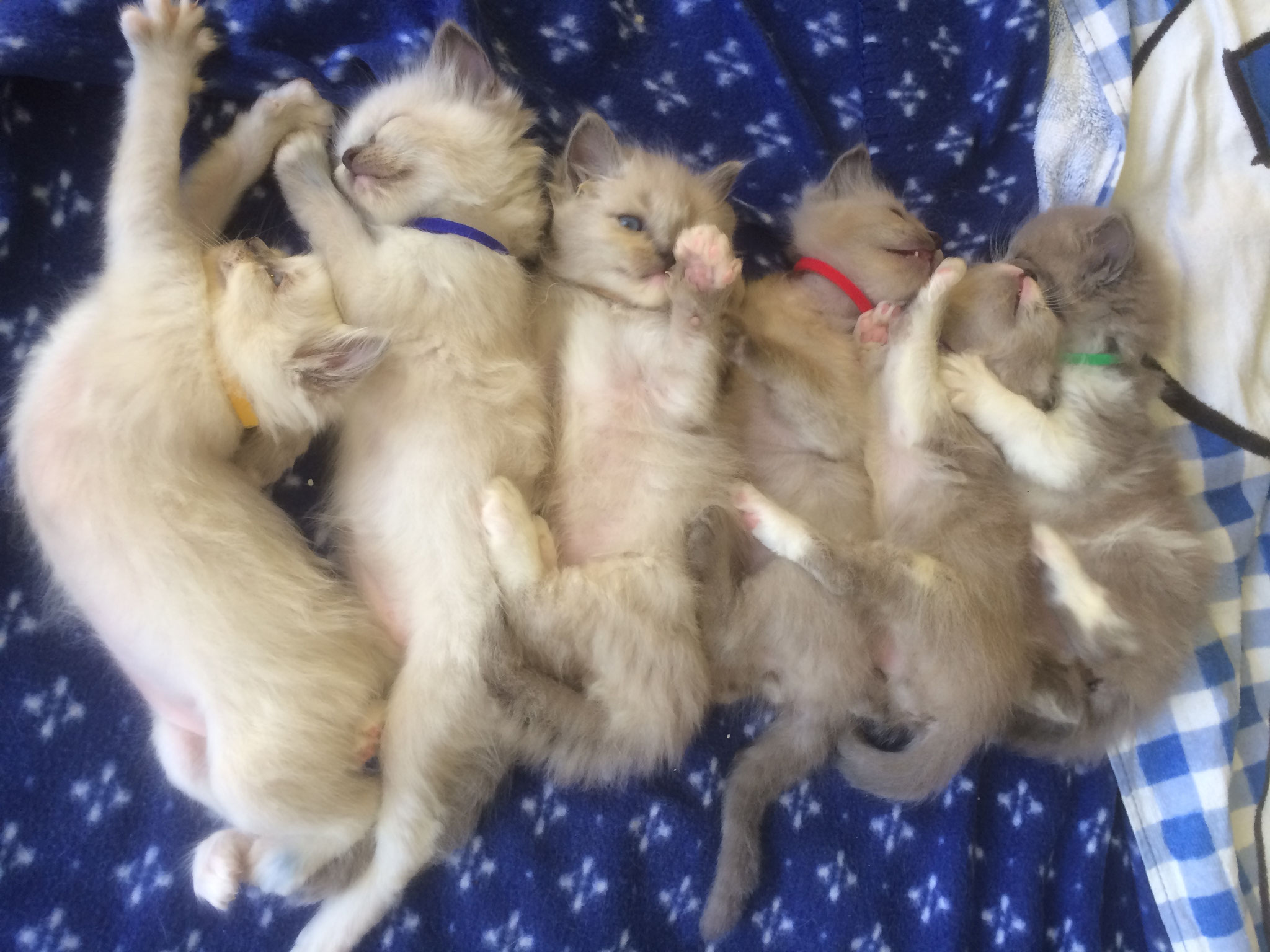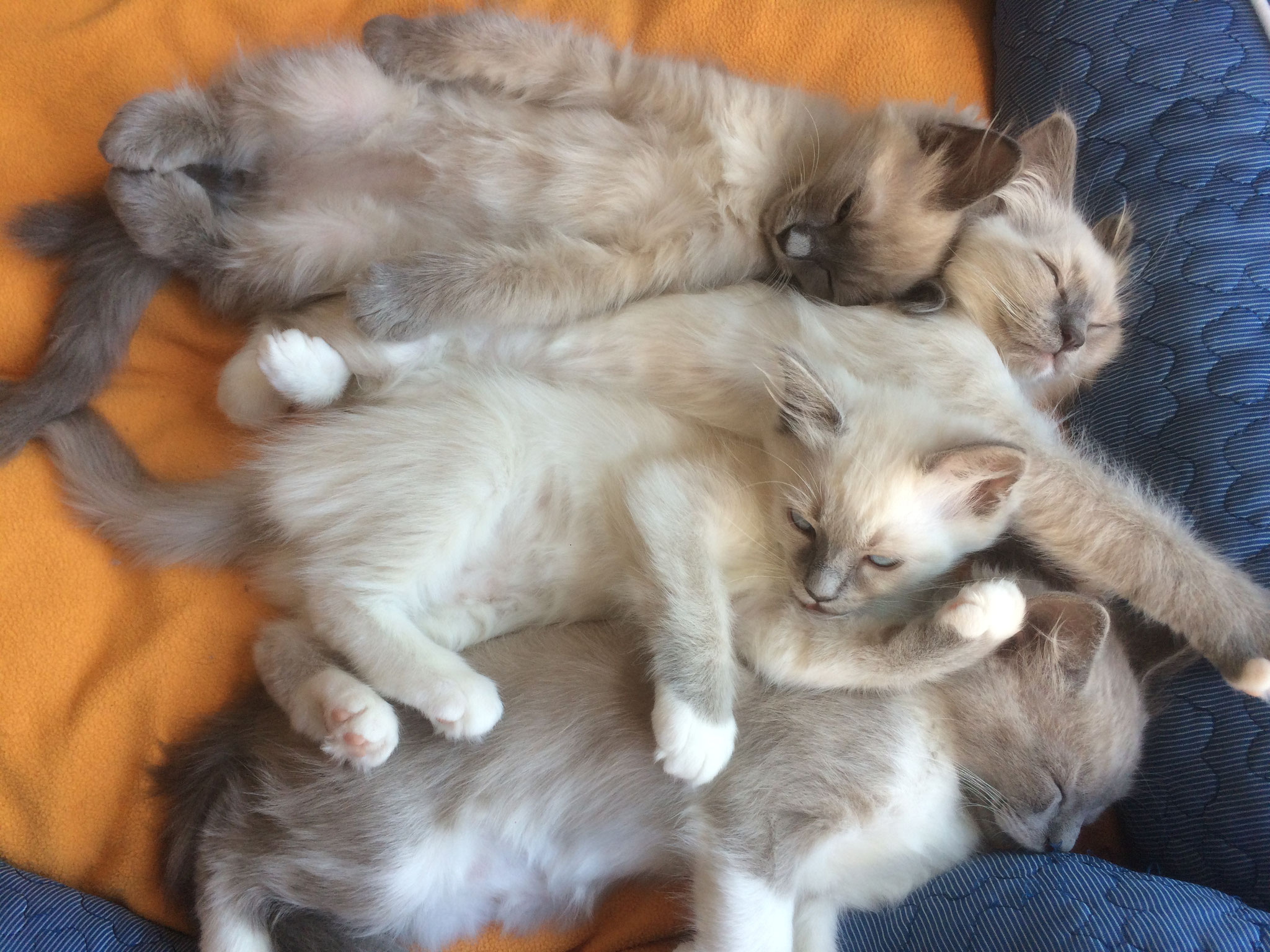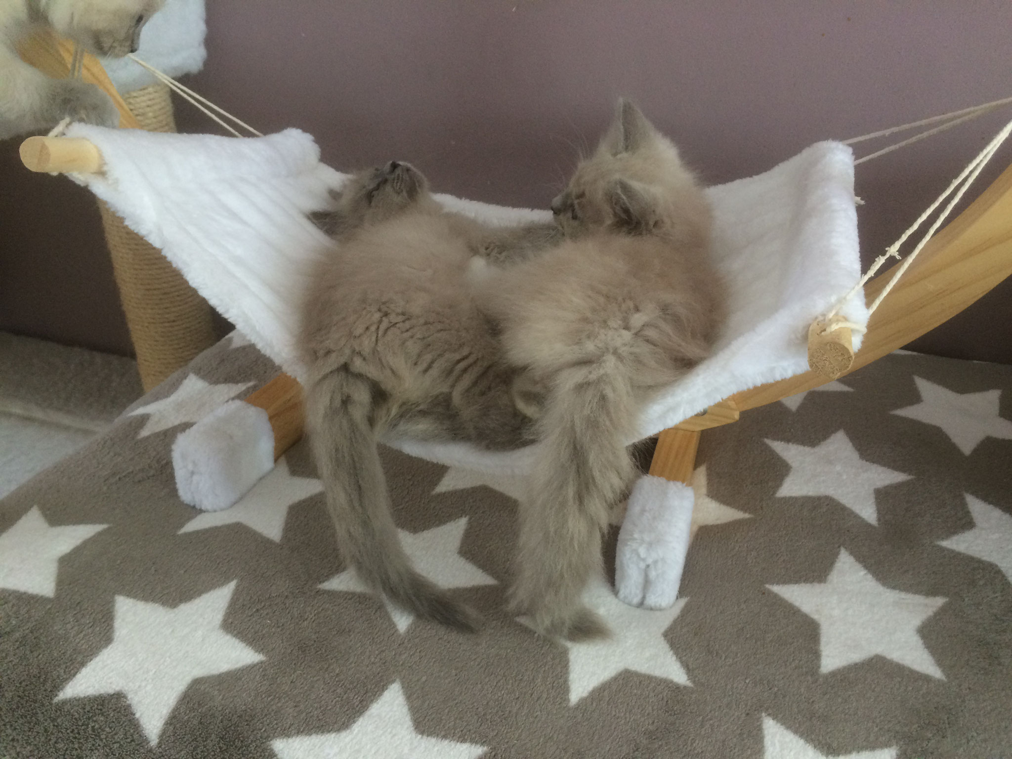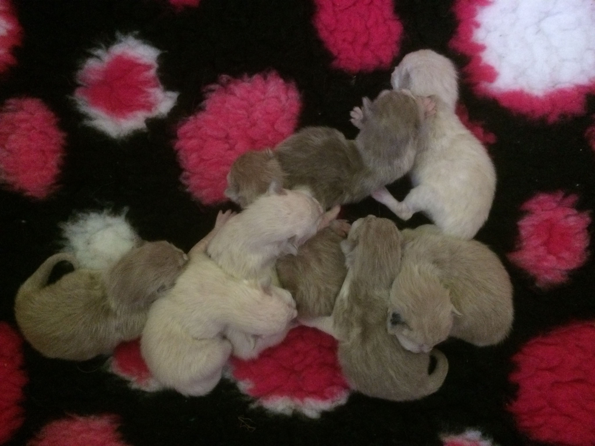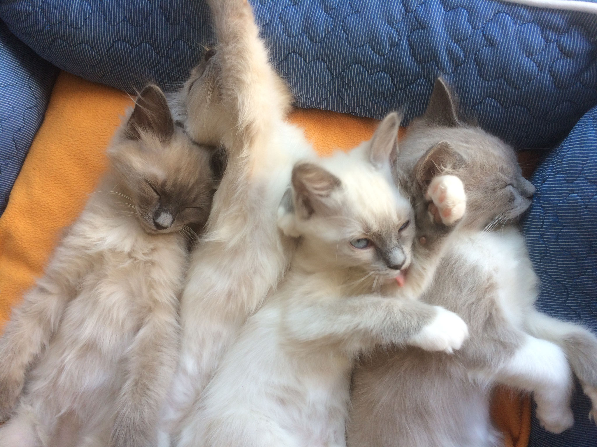 De kittens zijn vandaag 2 weken oud. Ik twijfel nog steeds over de kleur. Er zijn drie lichte kittens bij, maar die waren wel gekleurd bij de geboorte, dus ik weet niet goed wat ik ervan moet denken. Ofwel zijn ze lilac mink ofwel toch blue point. De anderen zijn blue mink denk ik en er zit één donkere bij dus dat zal een blue sepia zijn.