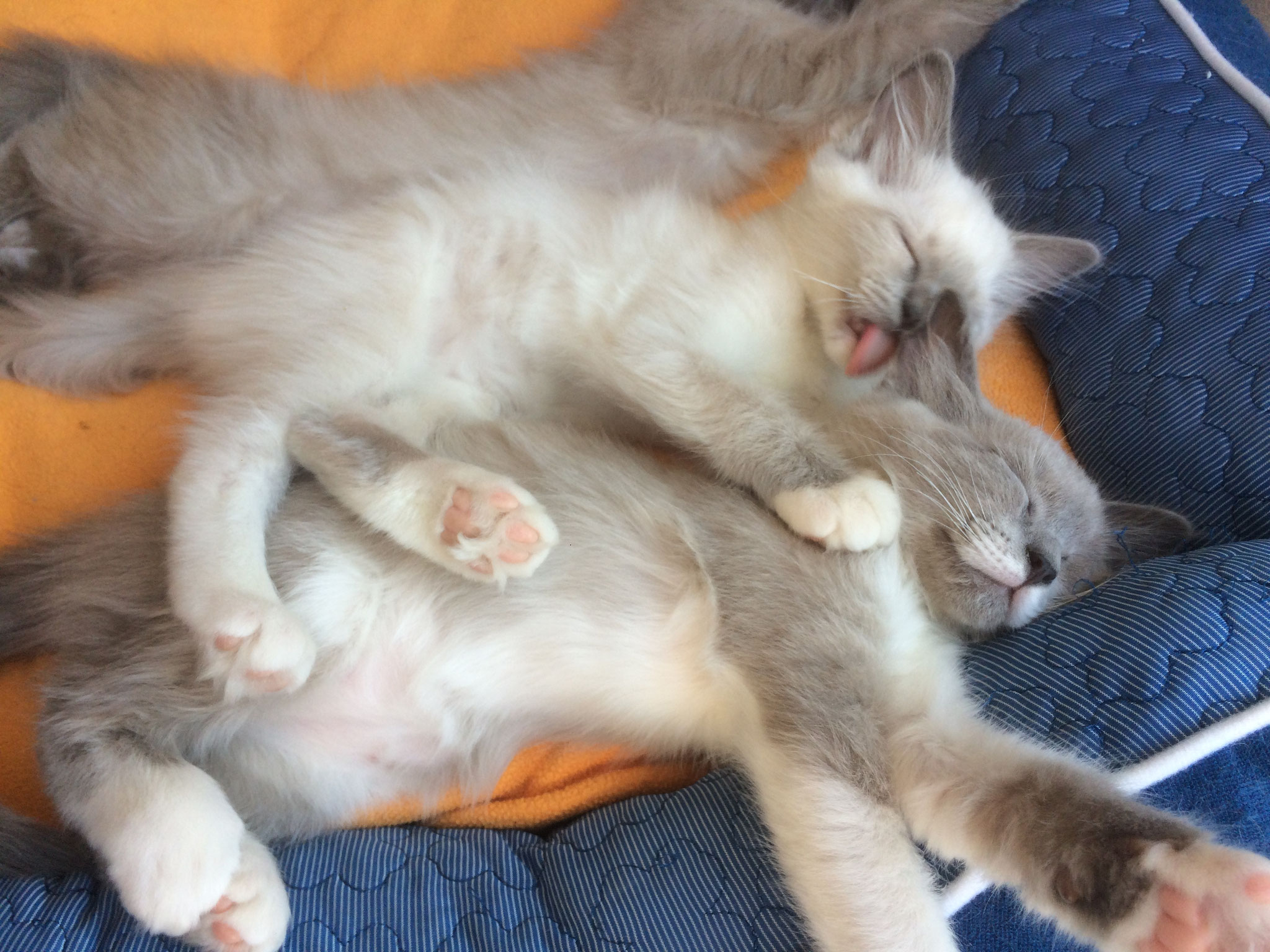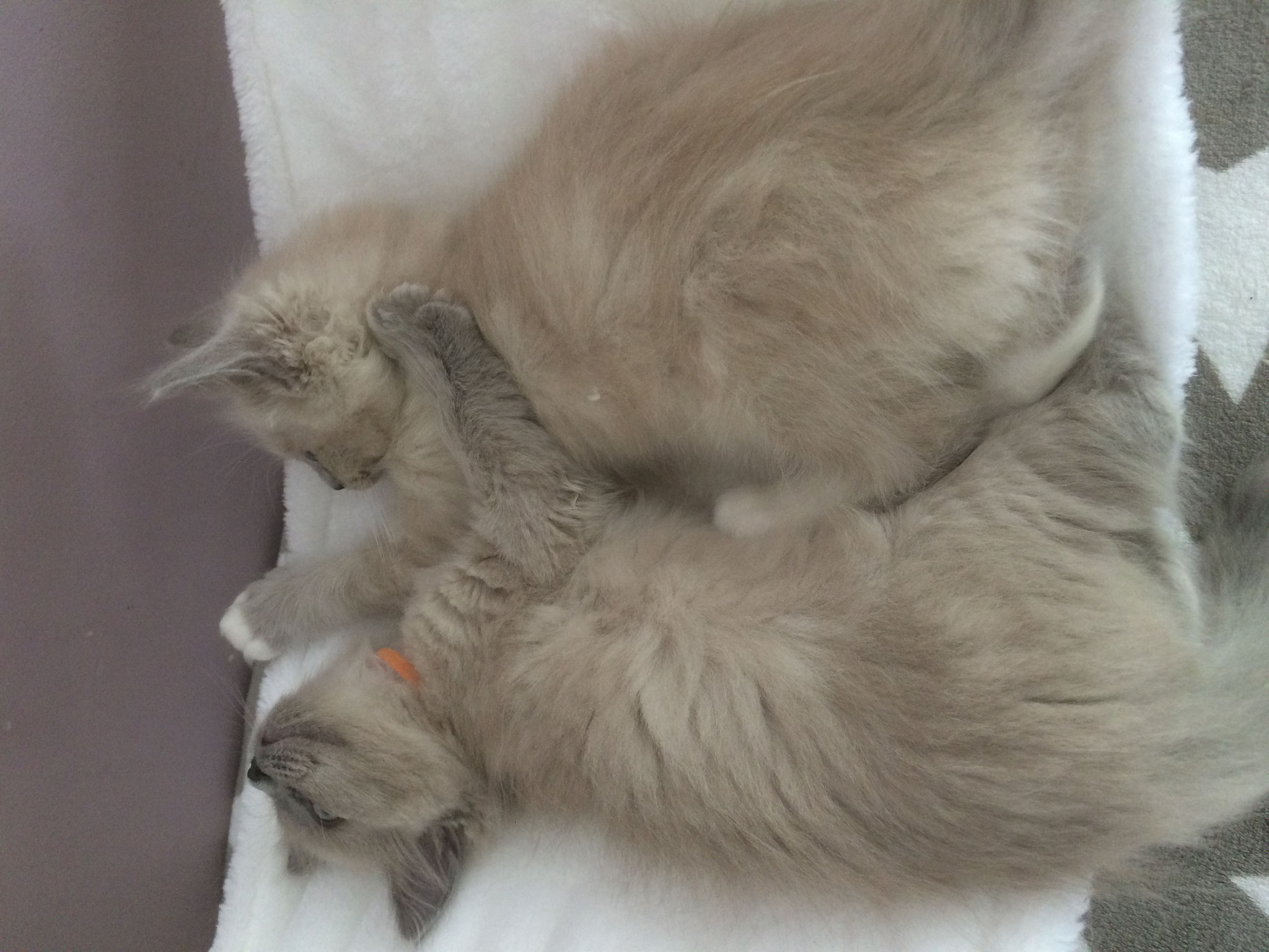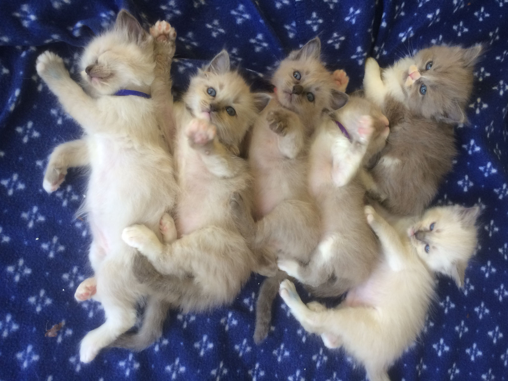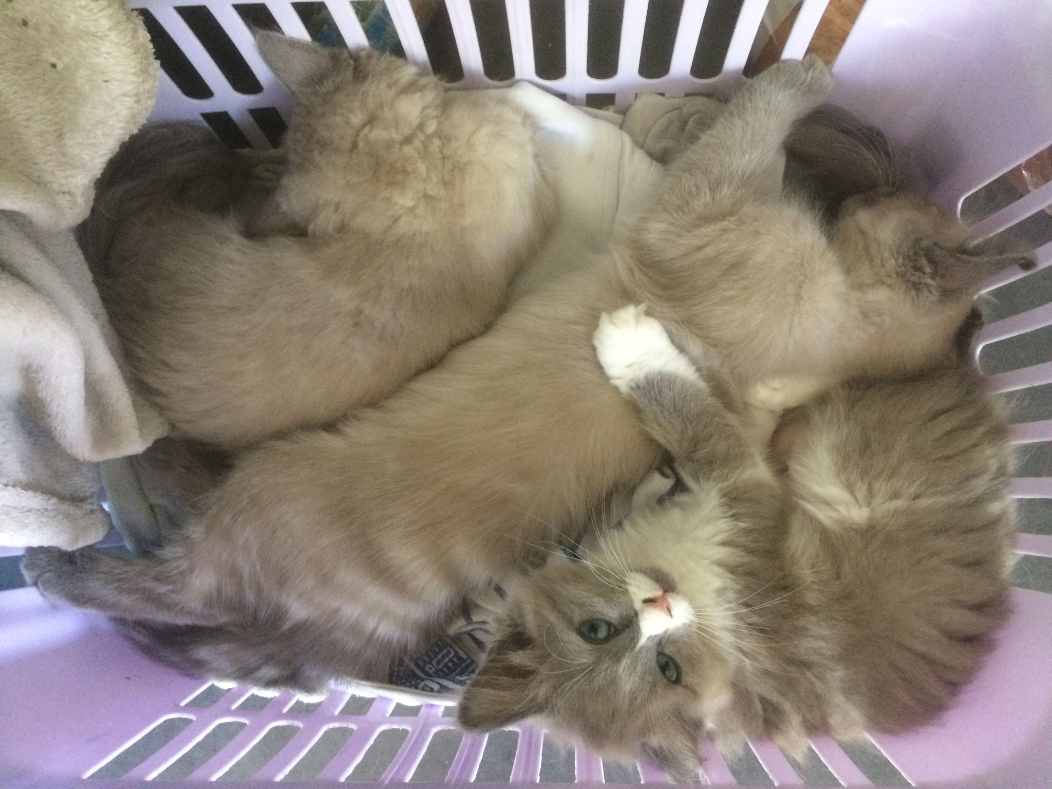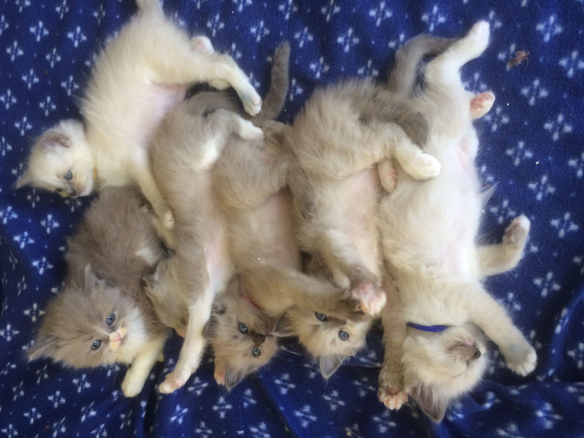 De kittens zijn vandaag 2 weken oud. Ik twijfel nog steeds over de kleur. Er zijn drie lichte kittens bij, maar die waren wel gekleurd bij de geboorte, dus ik weet niet goed wat ik ervan moet denken. Ofwel zijn ze lilac mink ofwel toch blue point. De anderen zijn blue mink denk ik en er zit één donkere bij dus dat zal een blue sepia zijn.