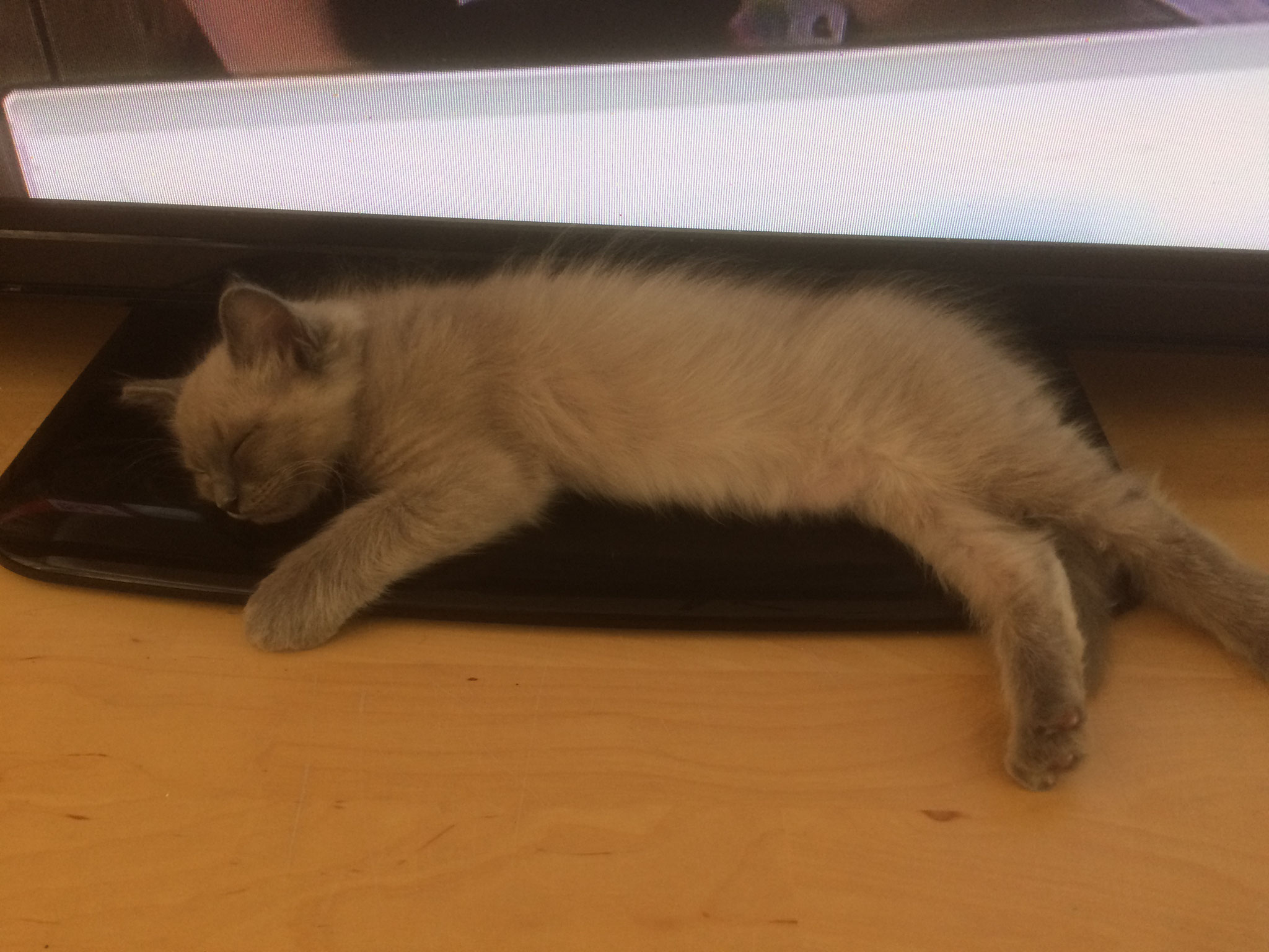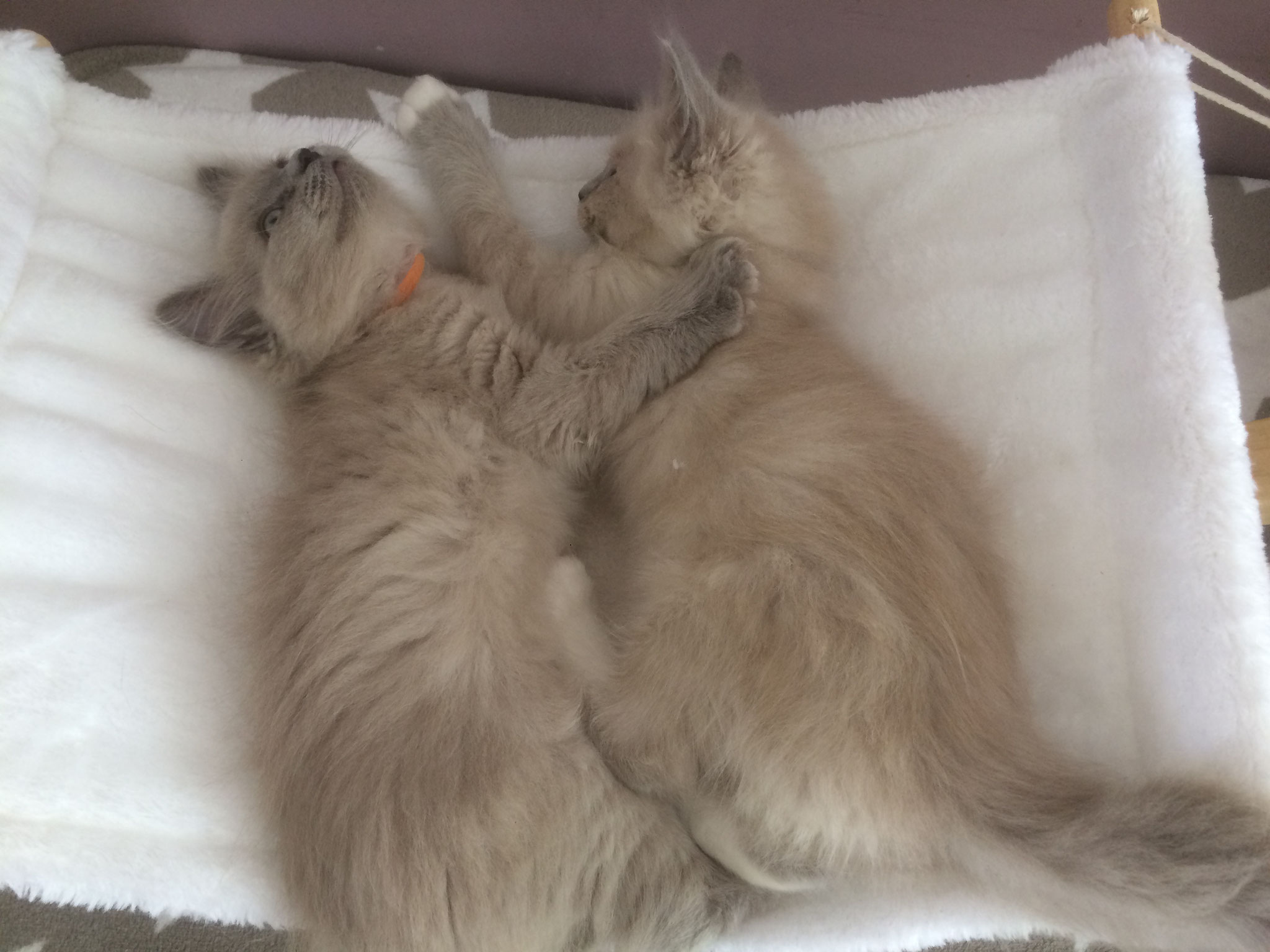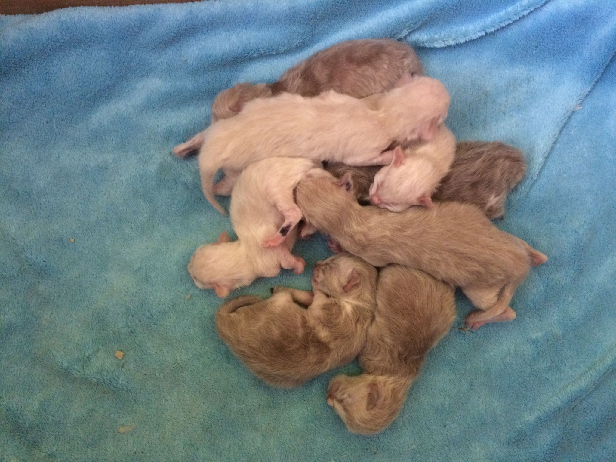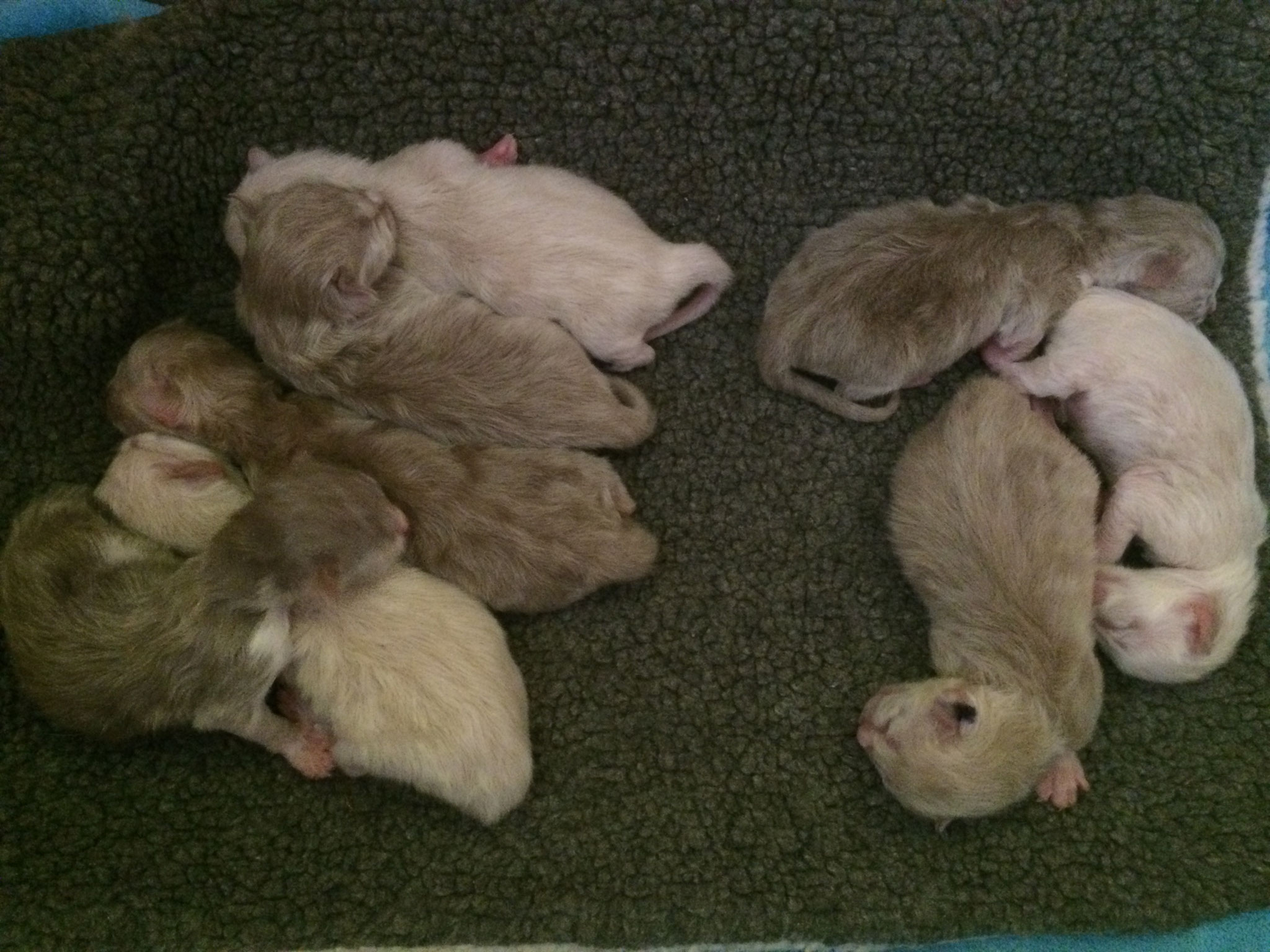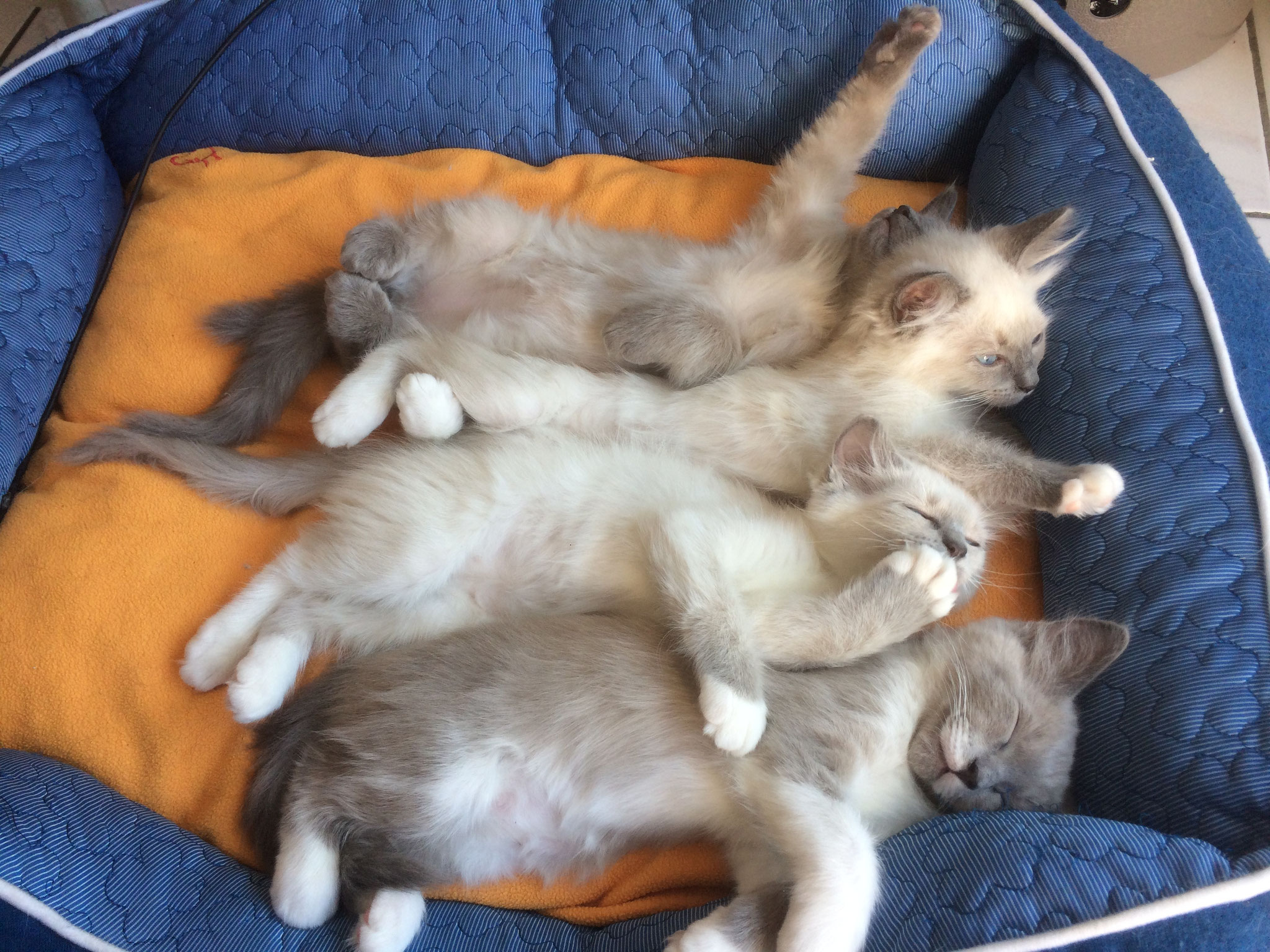 De kittens zijn vandaag 2 weken oud. Ik twijfel nog steeds over de kleur. Er zijn drie lichte kittens bij, maar die waren wel gekleurd bij de geboorte, dus ik weet niet goed wat ik ervan moet denken. Ofwel zijn ze lilac mink ofwel toch blue point. De anderen zijn blue mink denk ik en er zit één donkere bij dus dat zal een blue sepia zijn.