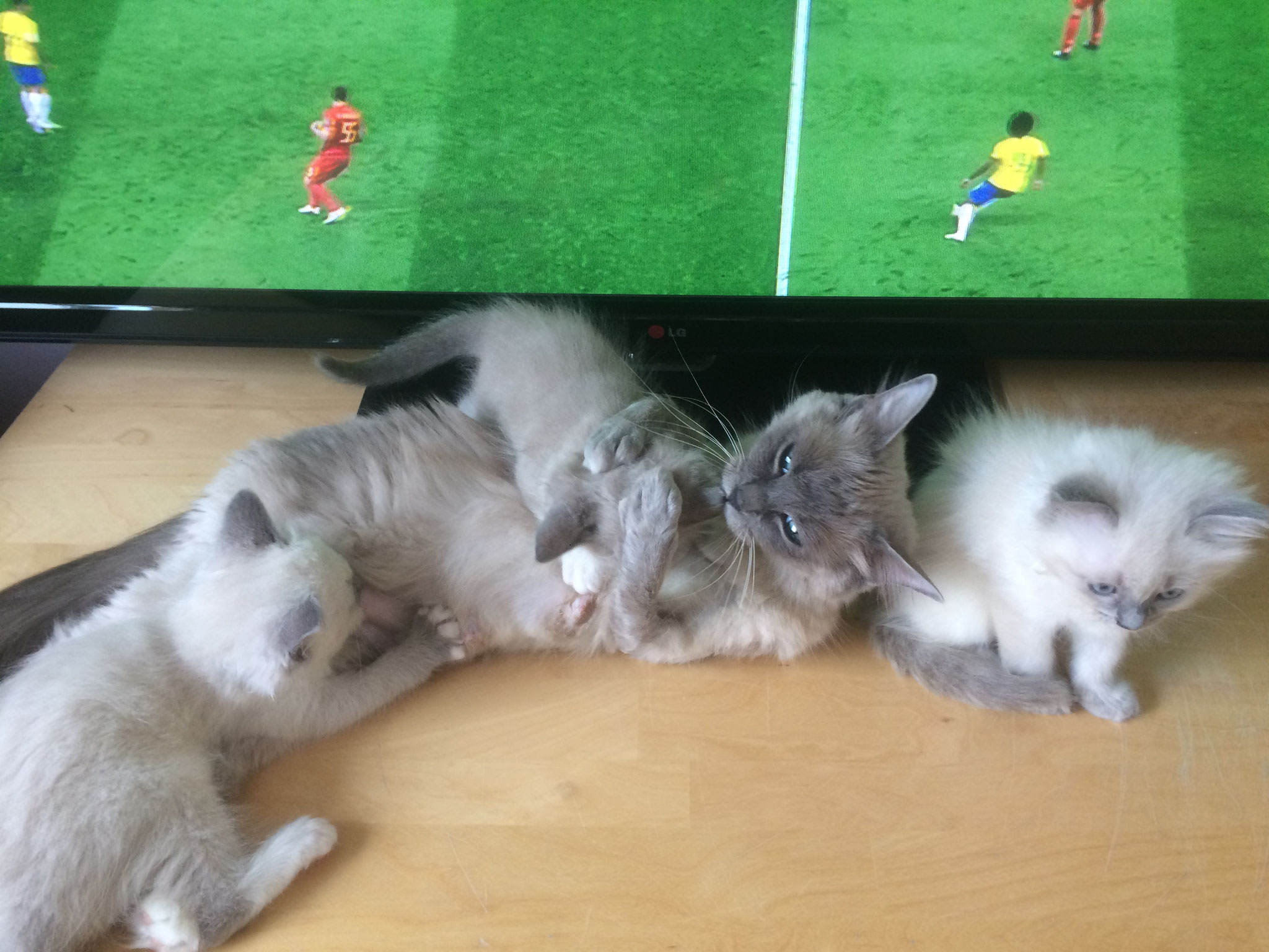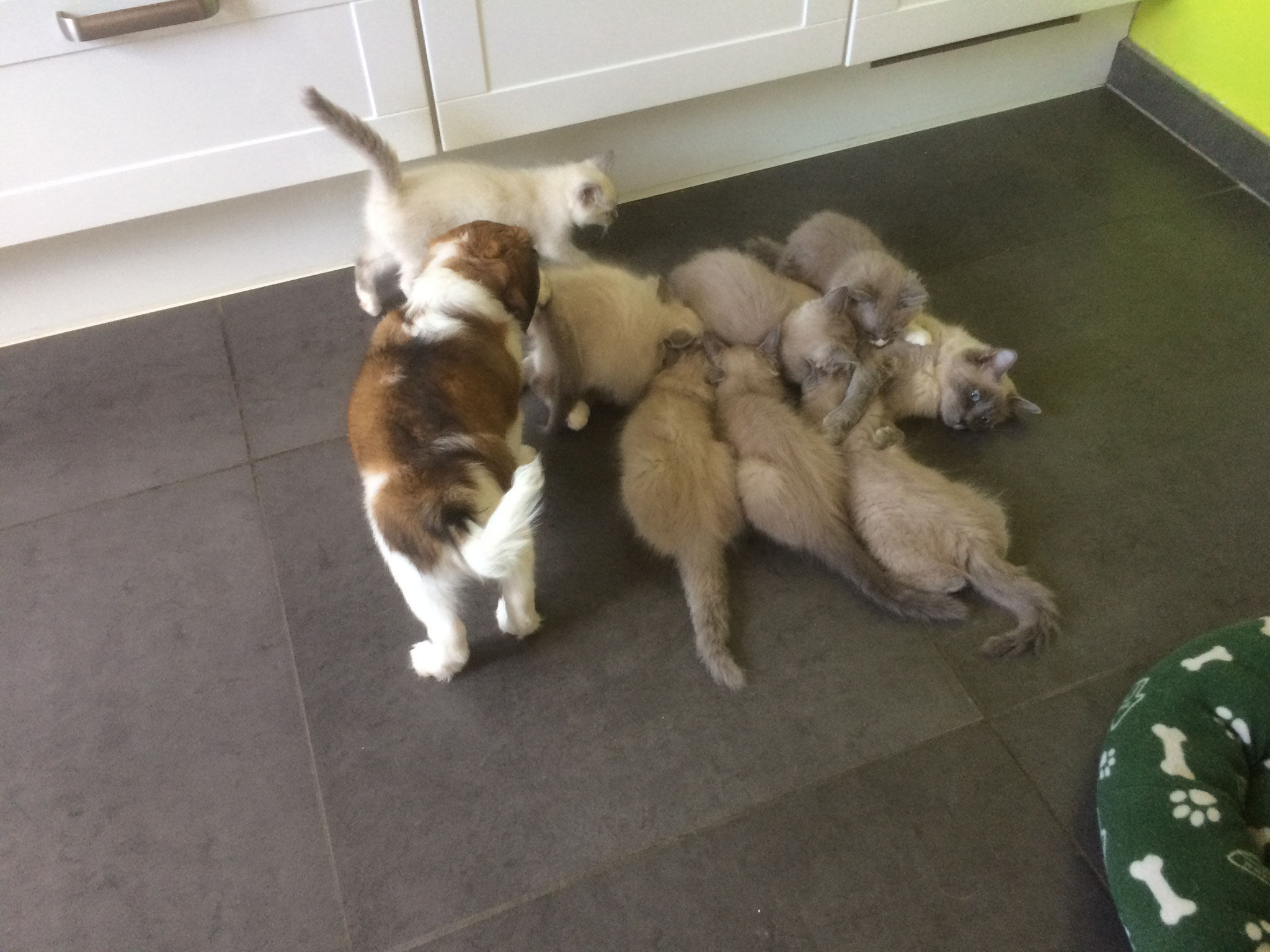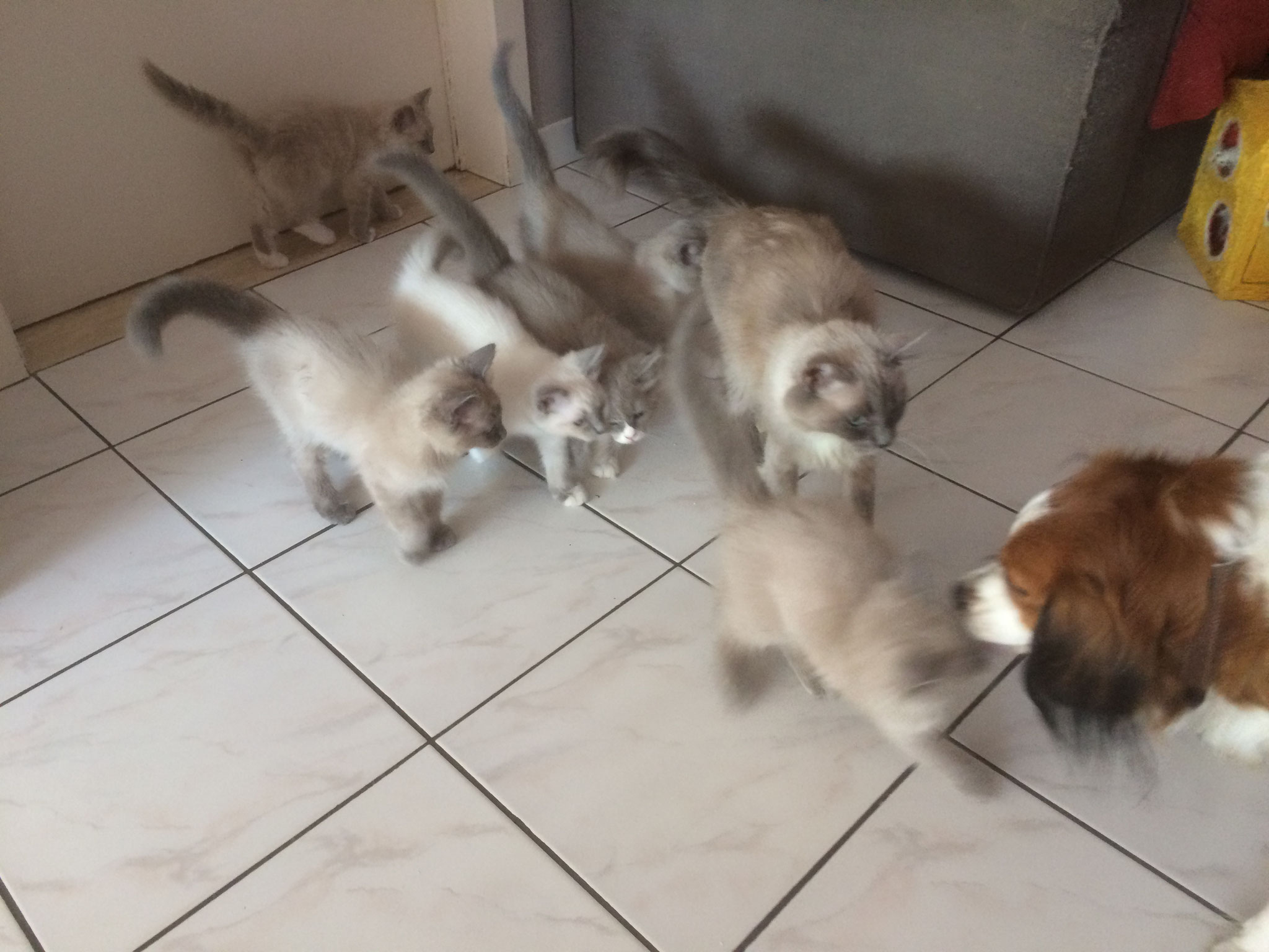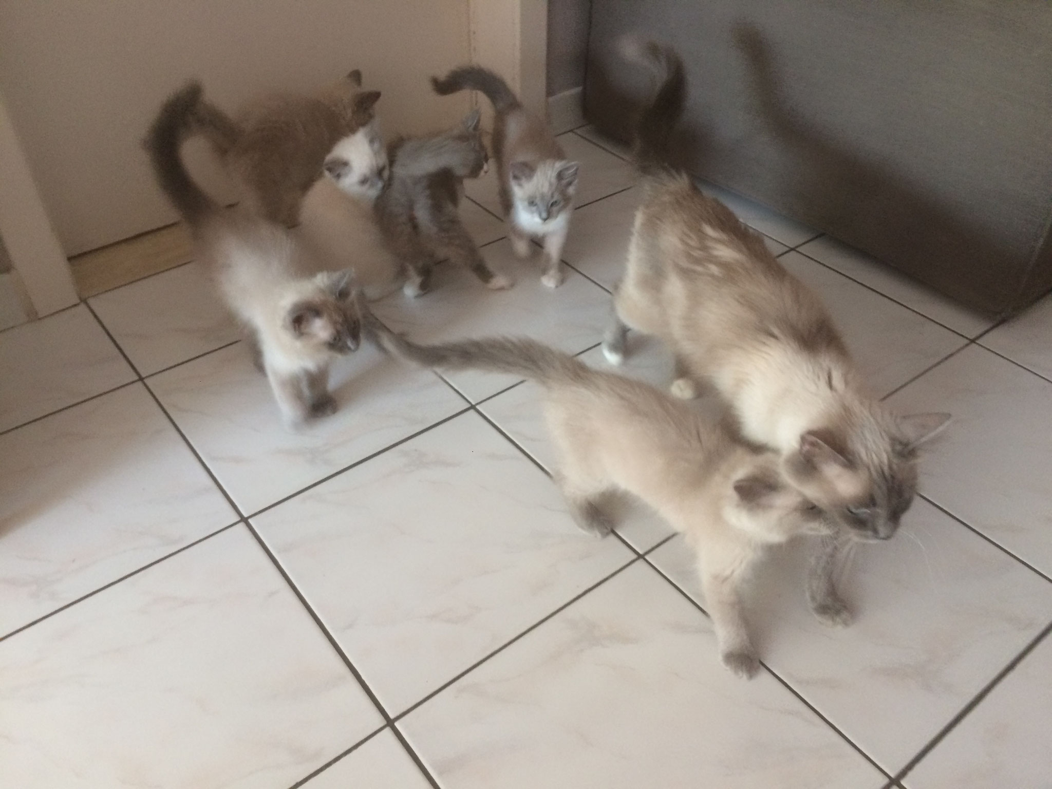 24 juni : de kittens zijn 6 weken oud. De verschillen in kleur worden duidelijker, maar toch ben ik nog niet zeker. Kitten nr 5 en nr 8 zijn duidelijk Sepia, maar wat met kitten nr 2 en nr 4 ? Mink of sepia ? Ik blijf hier heel slecht in.
